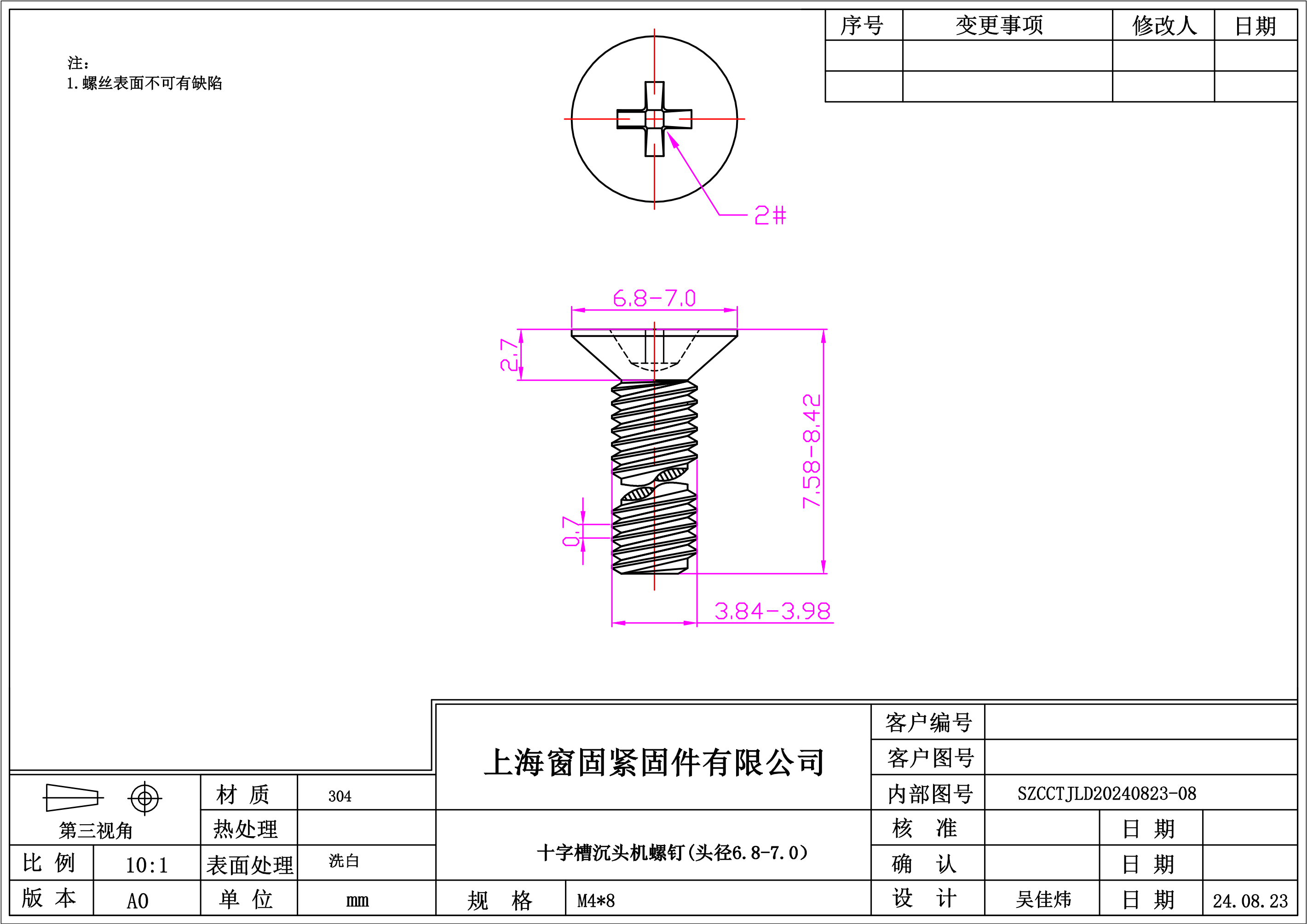 不锈钢304十字沉头机螺钉~4*8~洗白~(头径6.8-7)