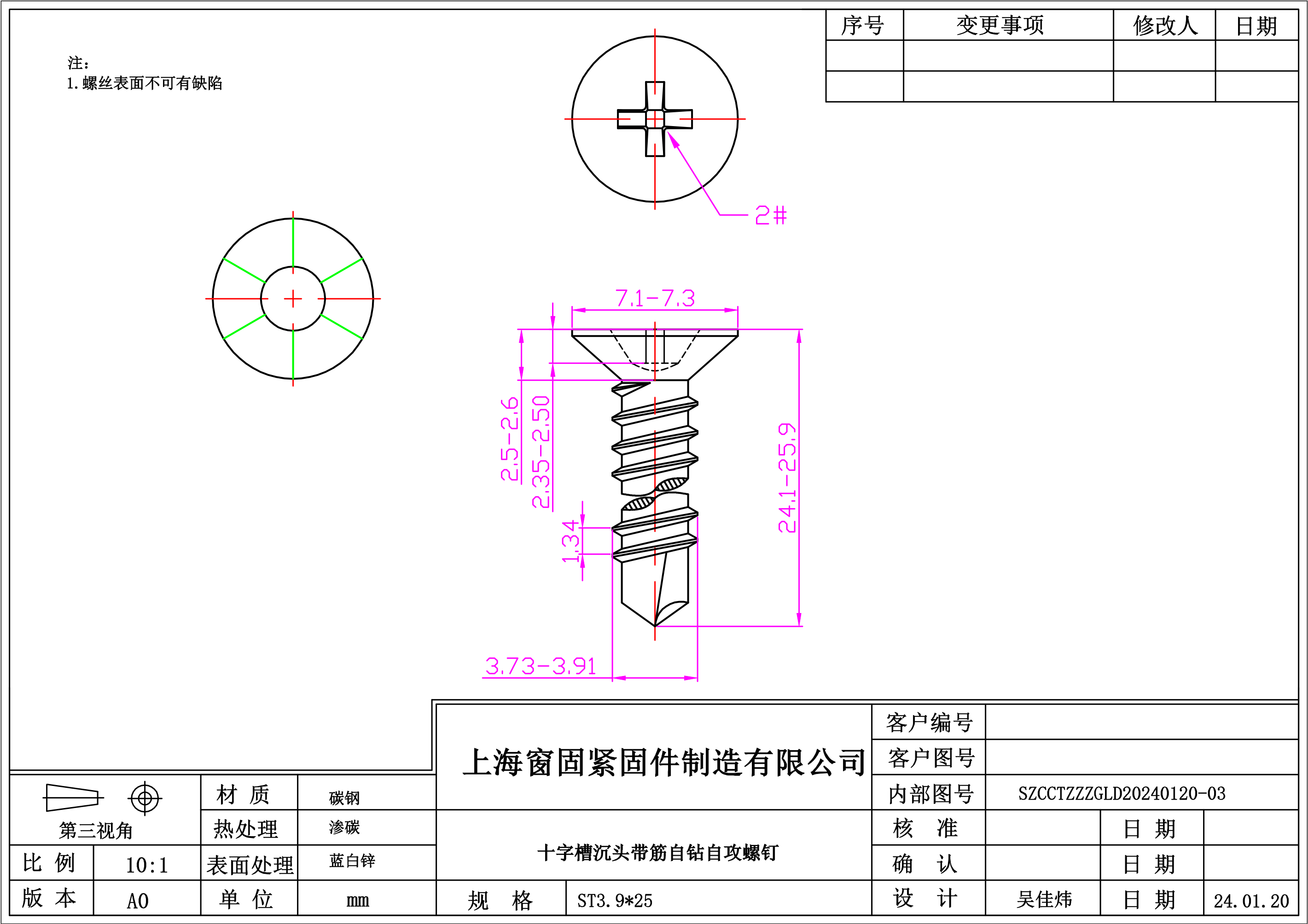 十字沉头带筋自钻自攻螺钉~3.9*25~蓝白锌