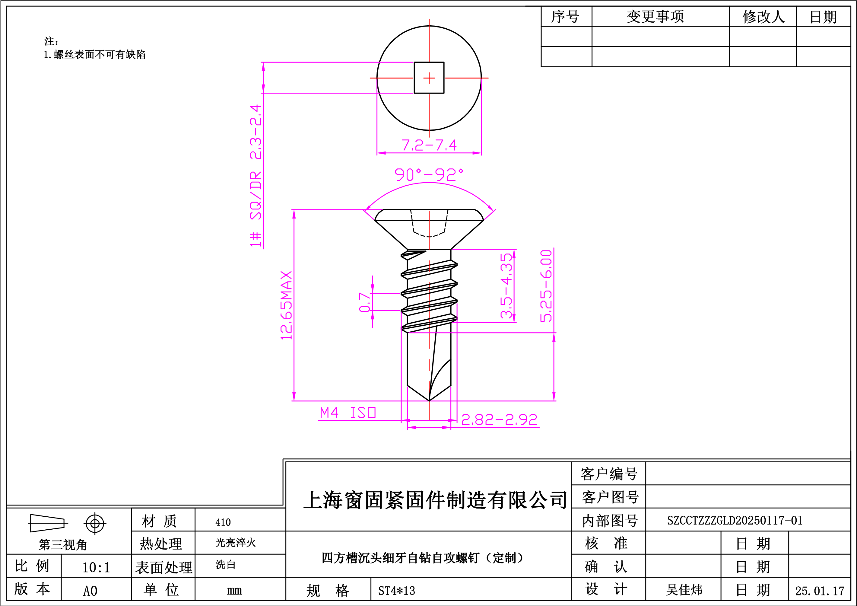 不锈钢410四方沉头细牙自钻自攻螺钉~4*13~洗白~(定制)