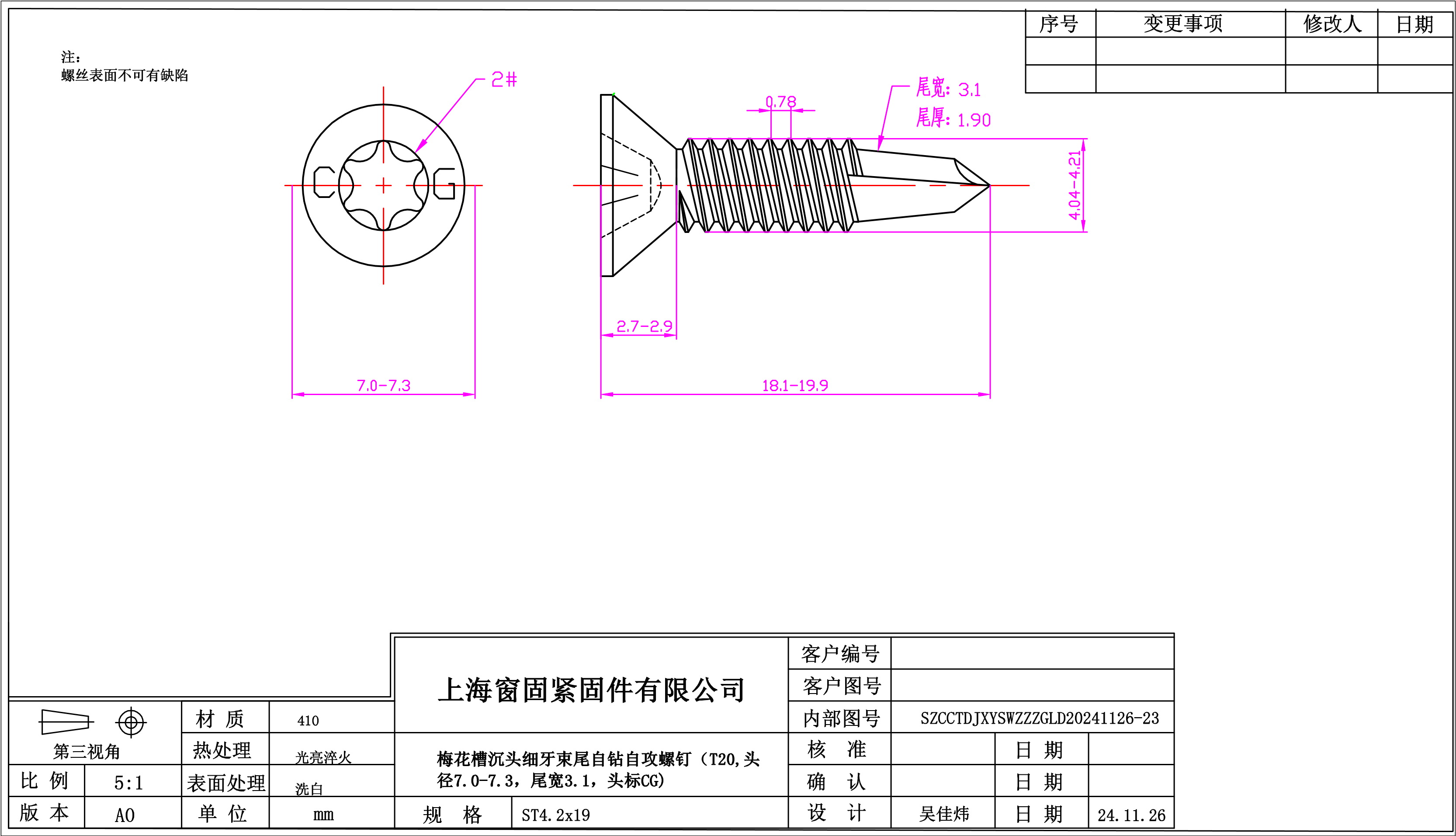 不锈钢410梅花沉头细牙束尾自钻自攻螺钉~4.2*19~洗白~(T20,头径7.0-7.3,尾宽3.1,头标CG)