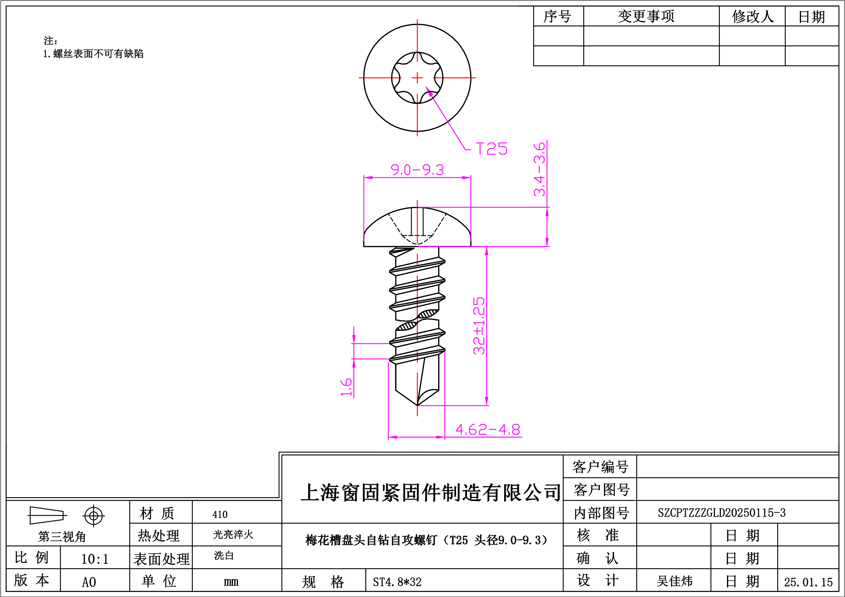 不锈钢410梅花盘头自钻自攻螺钉~4.8*32~洗白~(T25头径9.0-9.3)