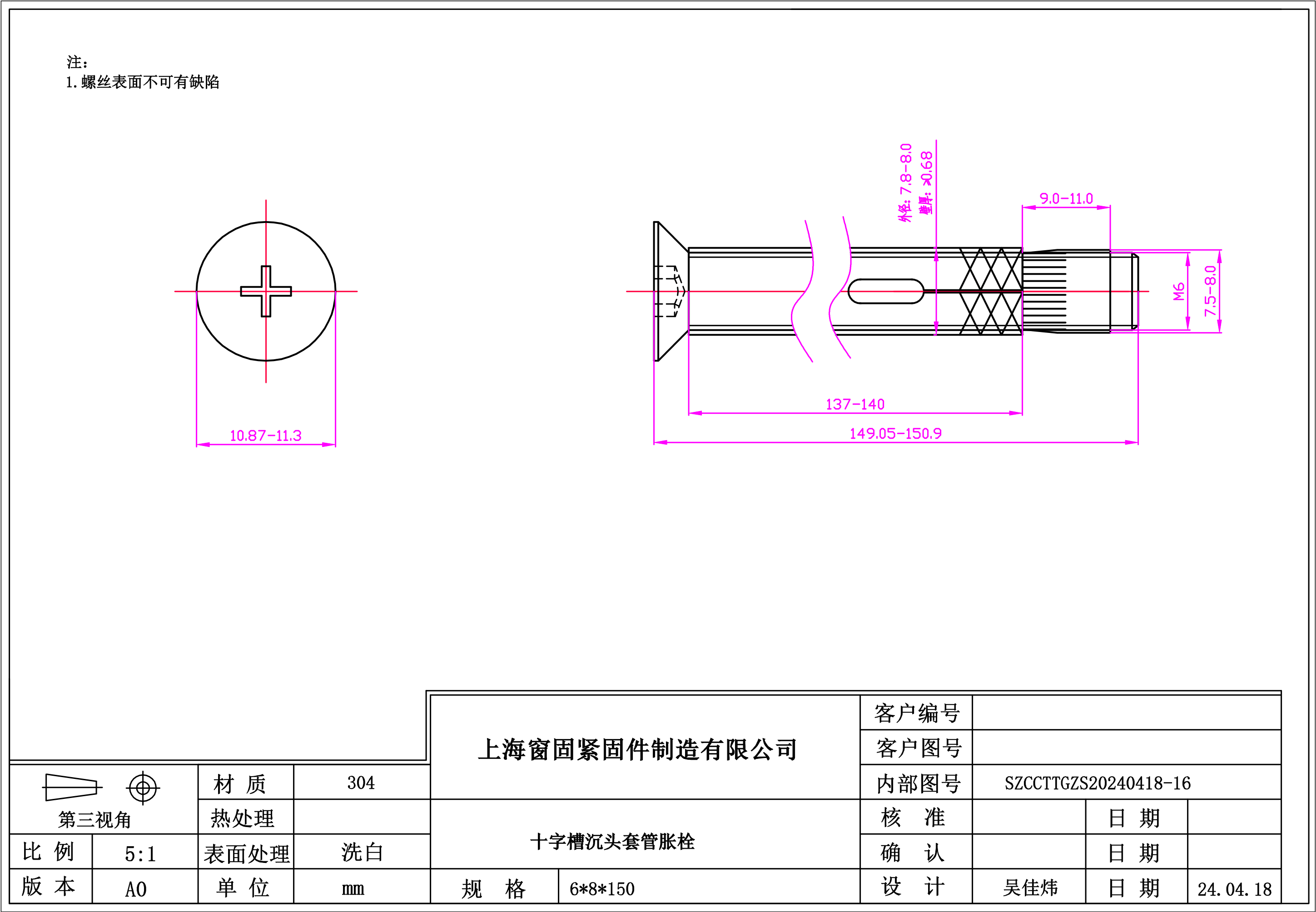 不锈钢304十字沉头套管胀栓~6*8*150~洗白~YP