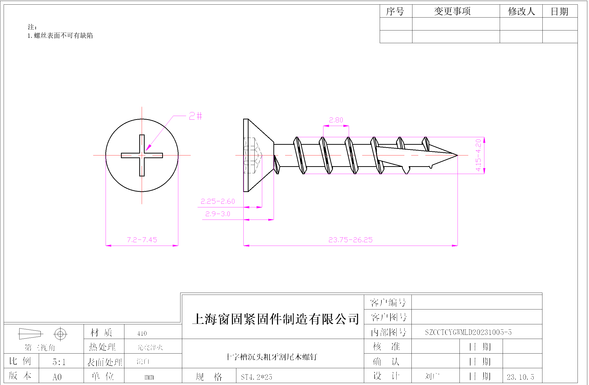 不锈钢410十字沉头粗牙割尾木螺钉~4.2*25~洗白~(外径≤4.2mm,头径7.2-7.45)
