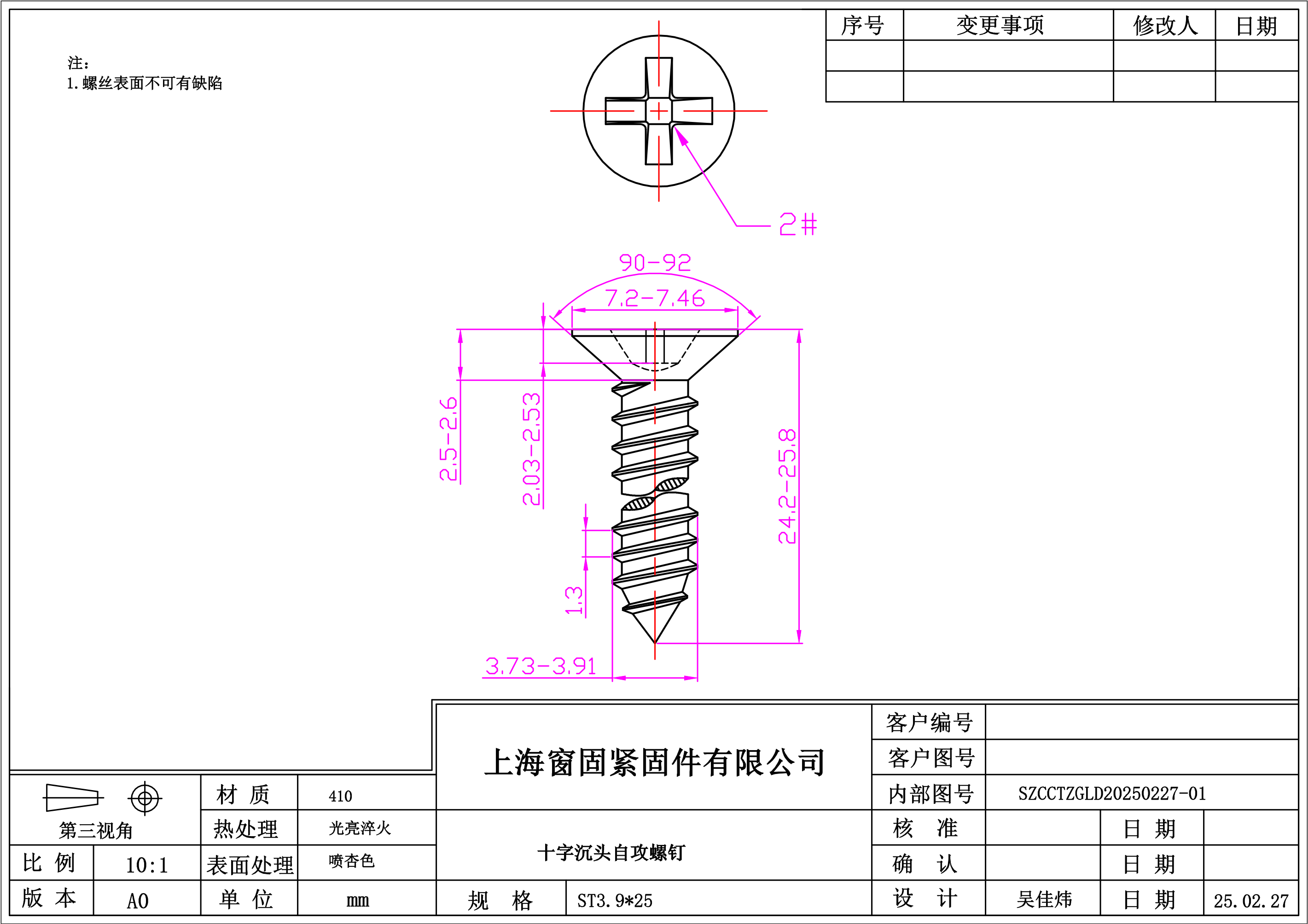 不锈钢410十字沉头自攻螺钉~3.9*25~喷杏色头