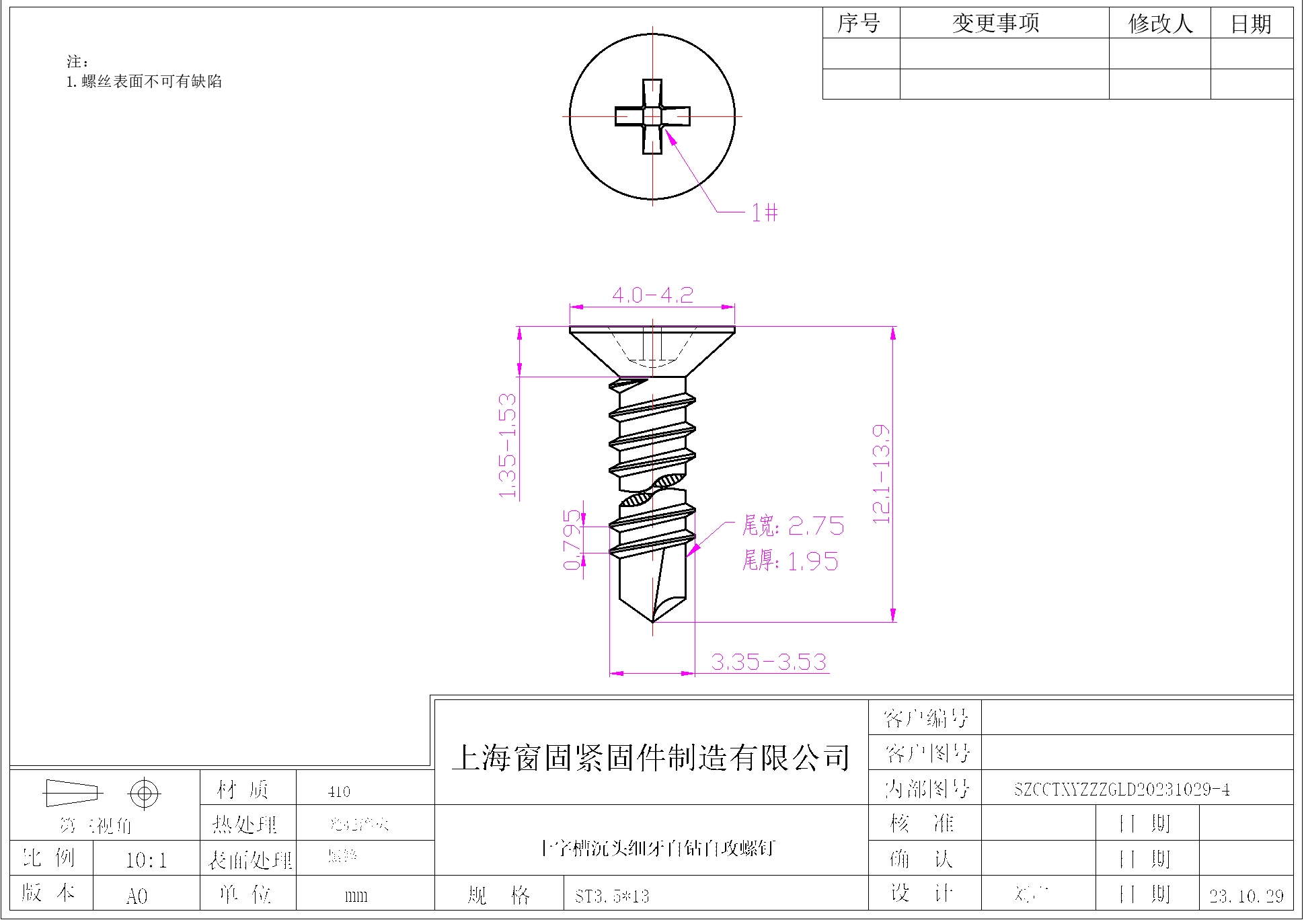 不锈钢410十字沉头细牙自钻自攻螺钉~3.5*13~洗白~(黑锌,PH1,头径4.0-4.4)
