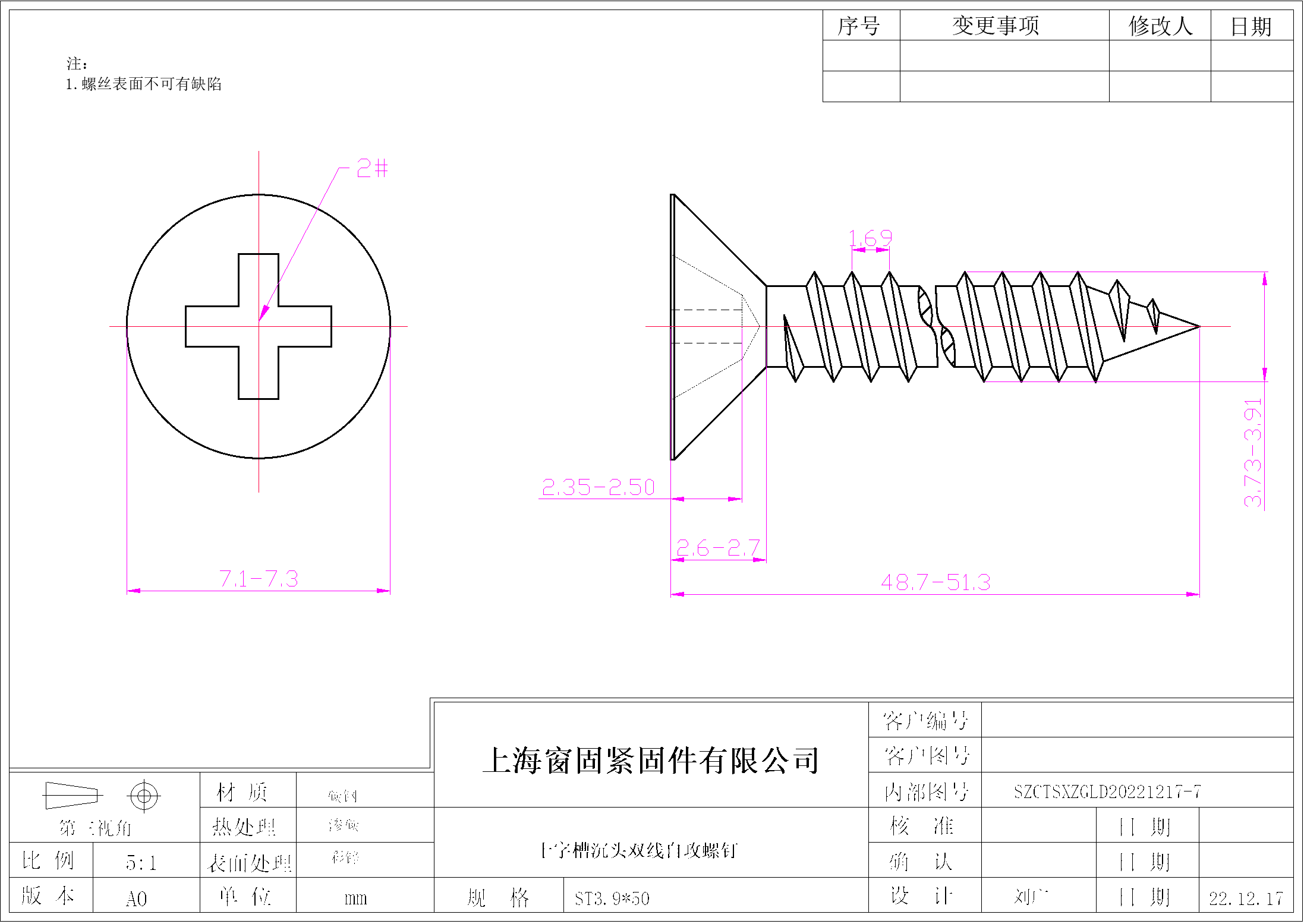 十字沉头双线自攻螺钉~3.9*50~五彩锌