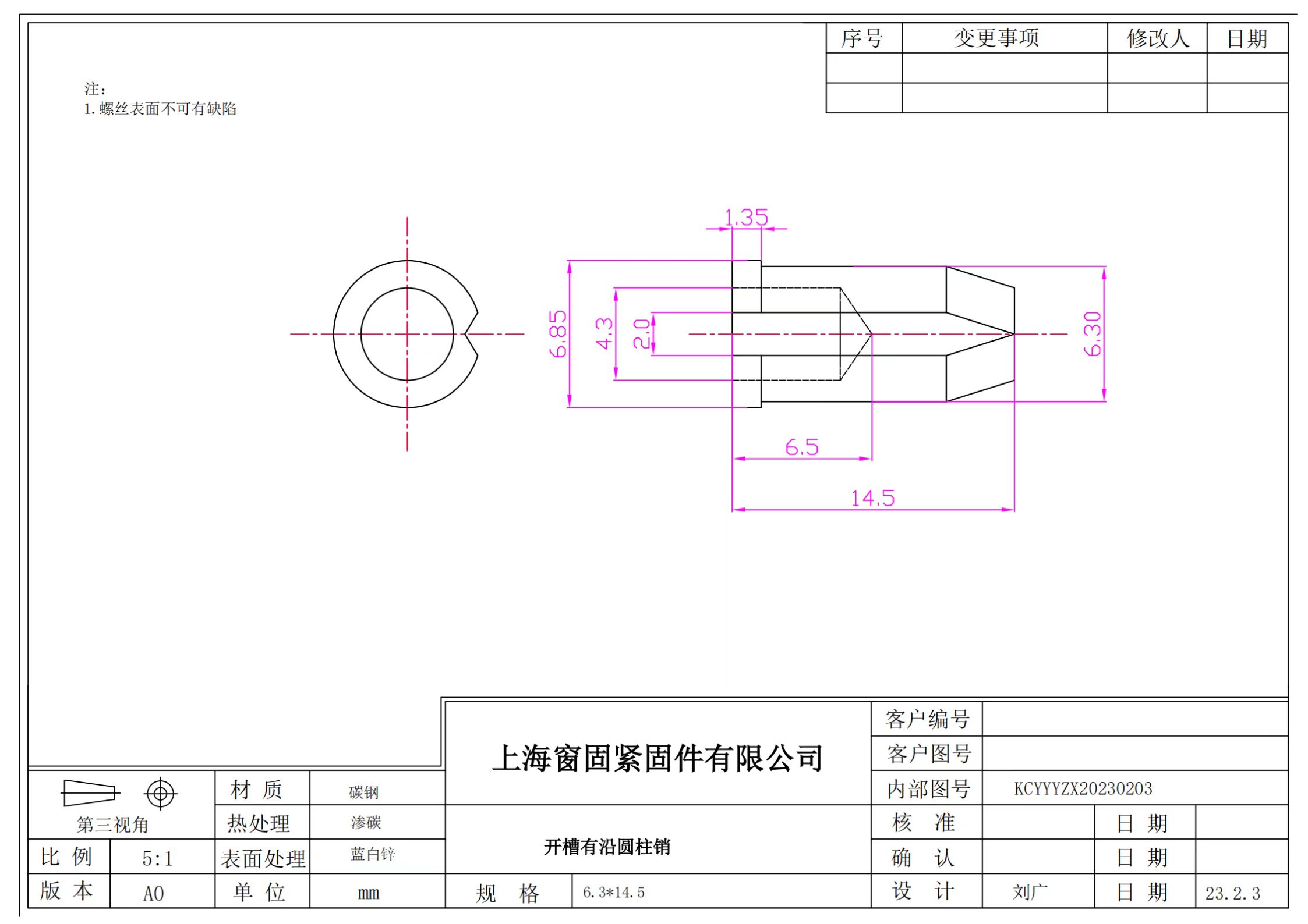 碳钢开槽有沿圆柱销~6.3*14.5~蓝白锌