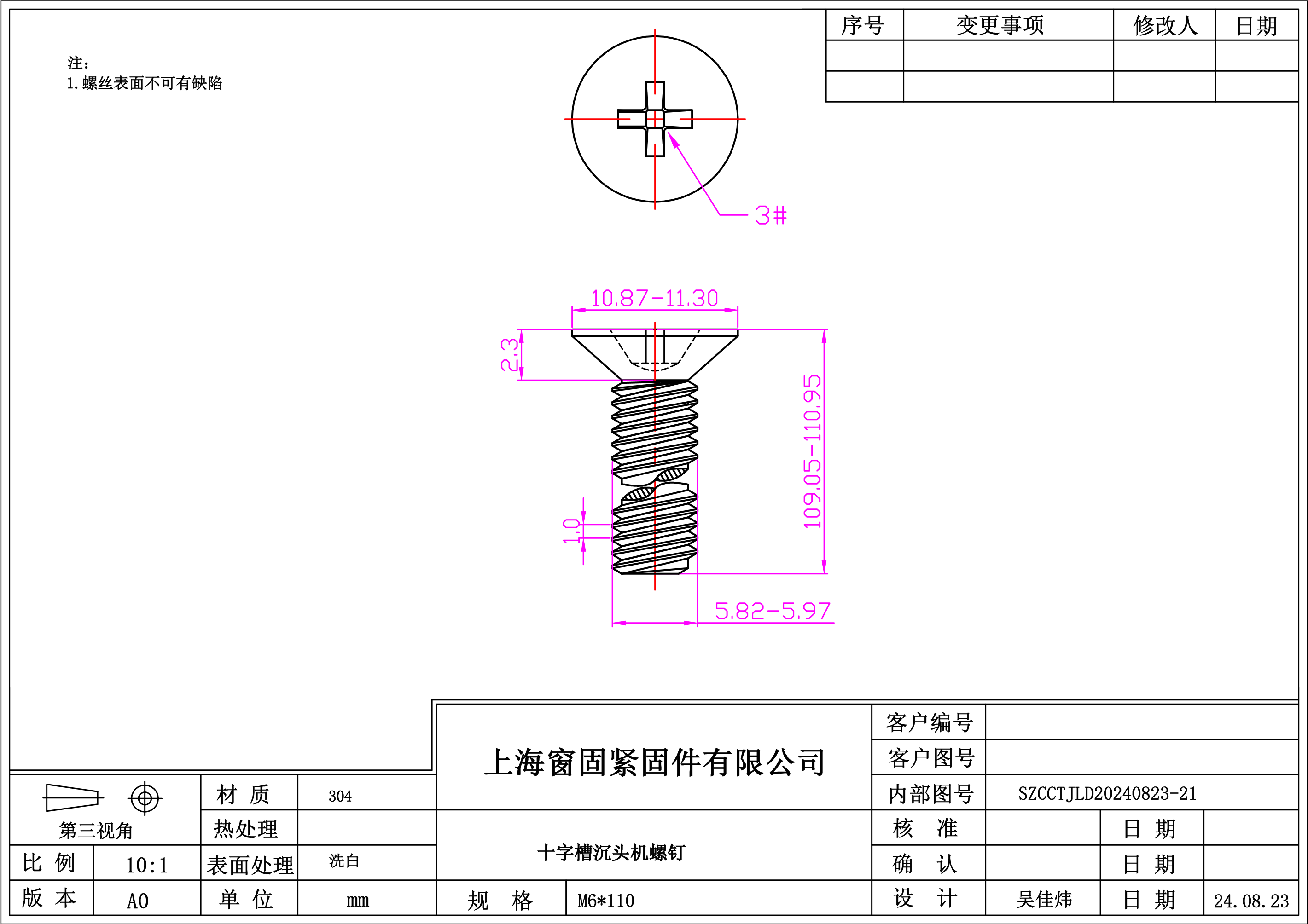 不锈钢304十字沉头机螺钉~6*110~洗白