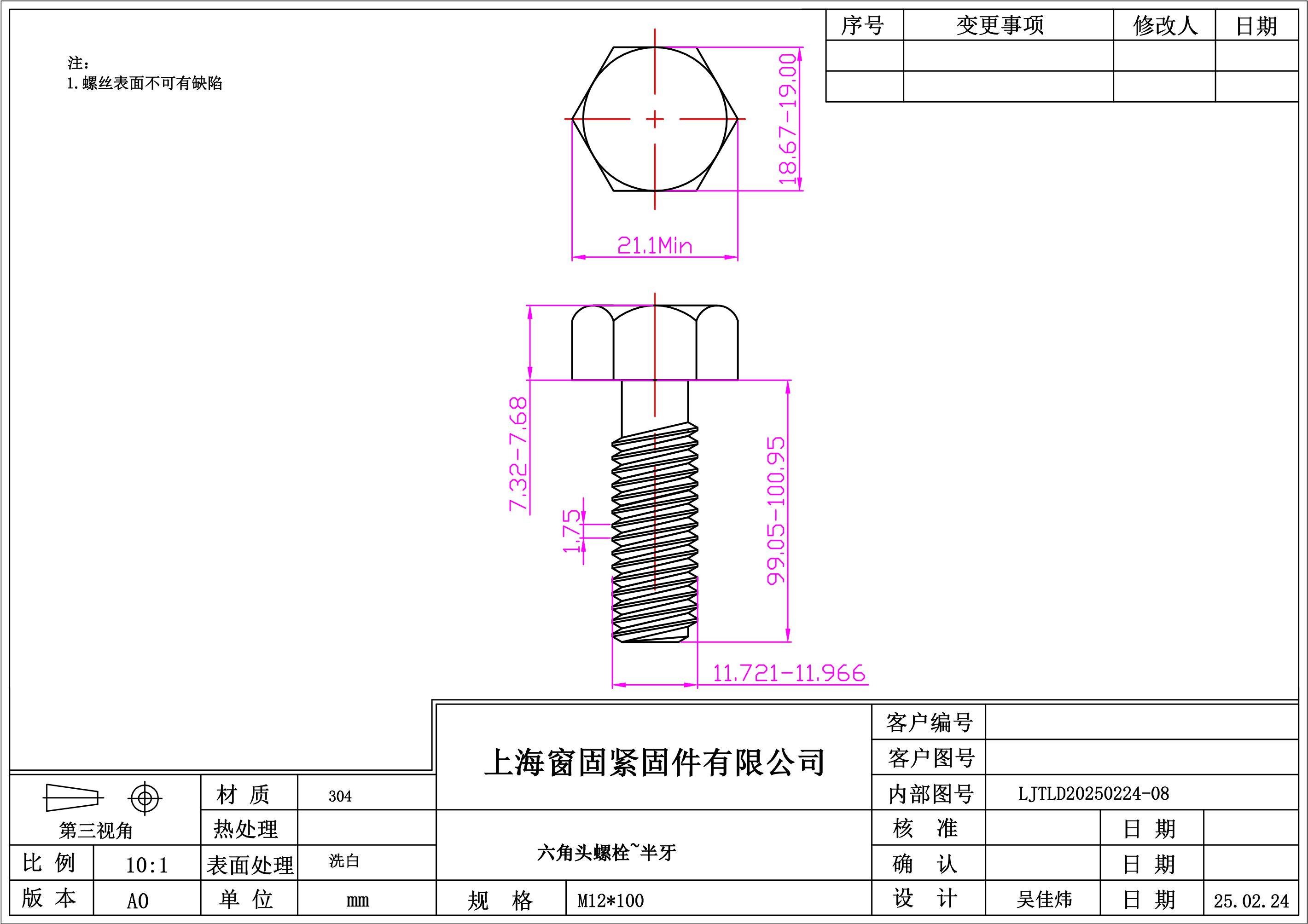 不锈钢304六角头螺栓~12*100~洗白~(半牙)