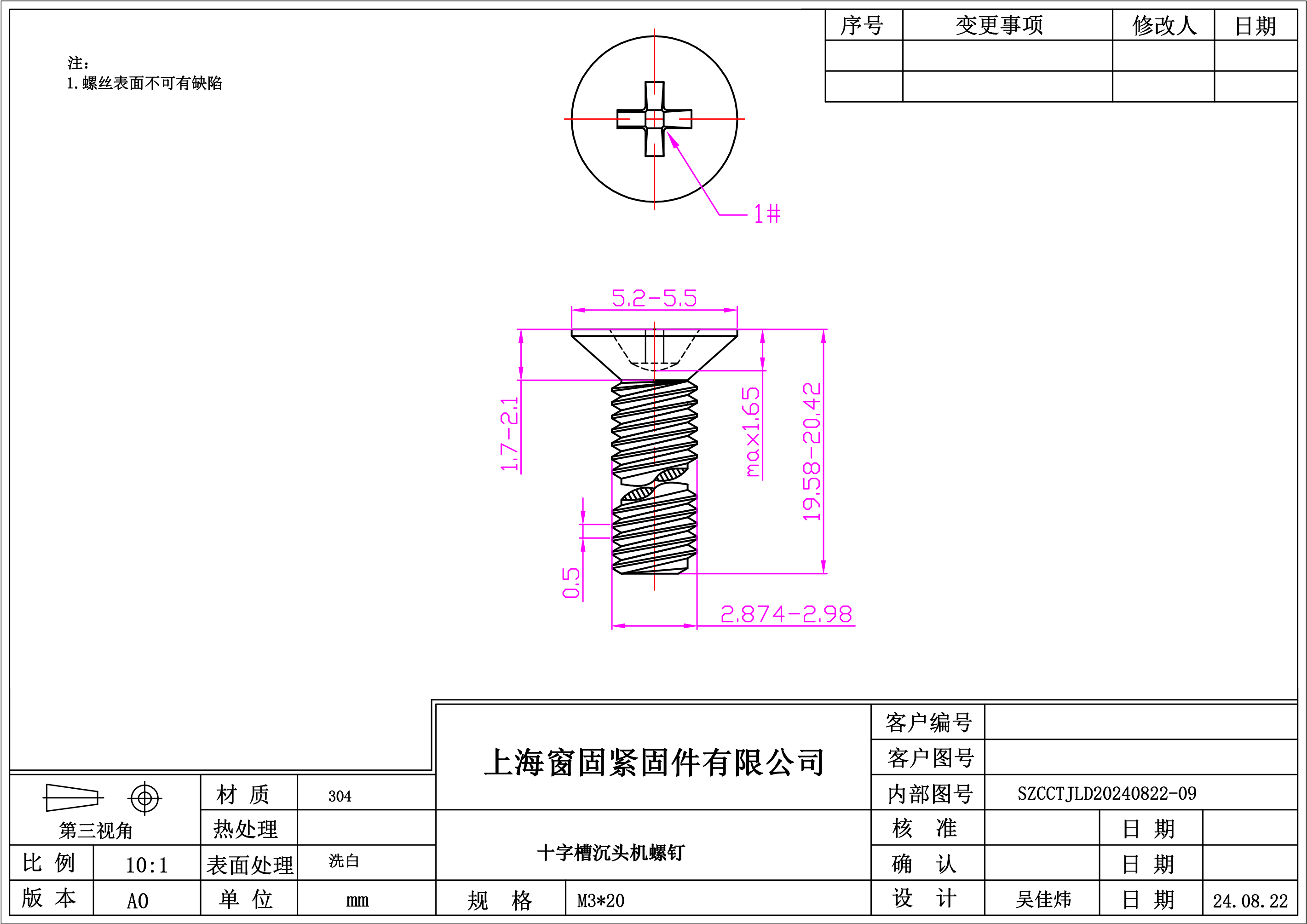 不锈钢304十字沉头机螺钉~3*20~洗白