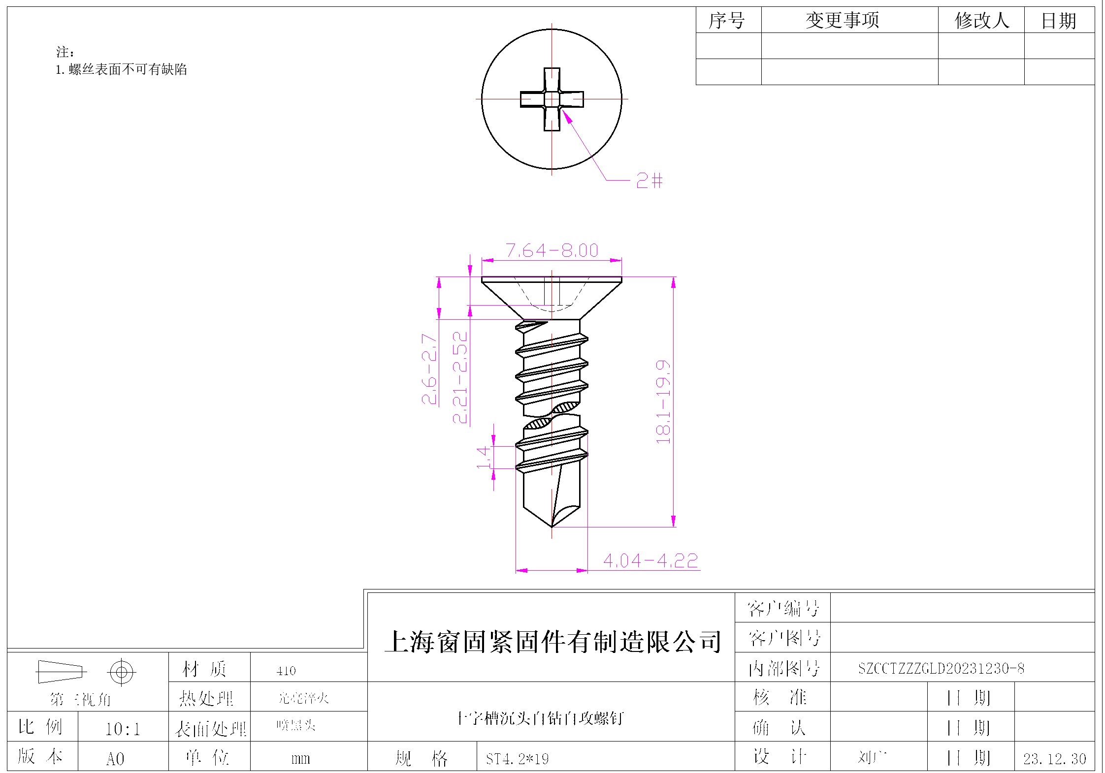 不锈钢410十字沉头自钻自攻螺钉~4.2*19~喷黑头