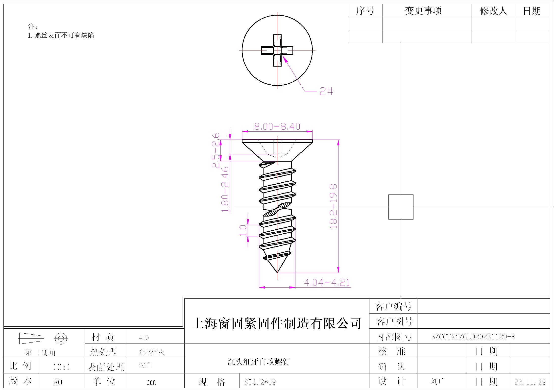 不锈钢410十字沉头细牙自攻螺钉~4.2*19~洗白