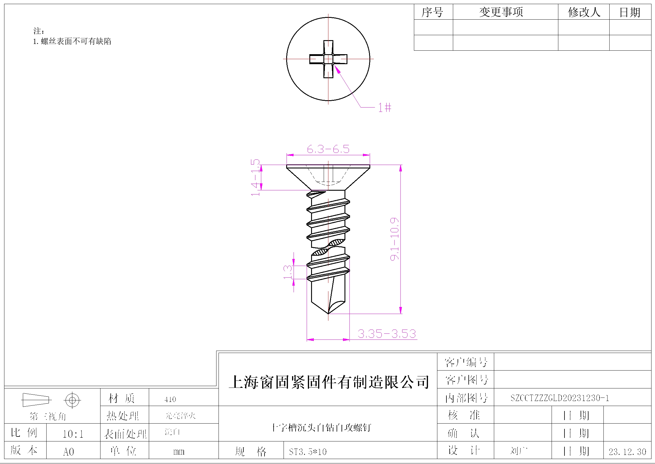 不锈钢410十字沉头自钻自攻螺钉~3.5*10~洗白~(头径6.3-6.5)