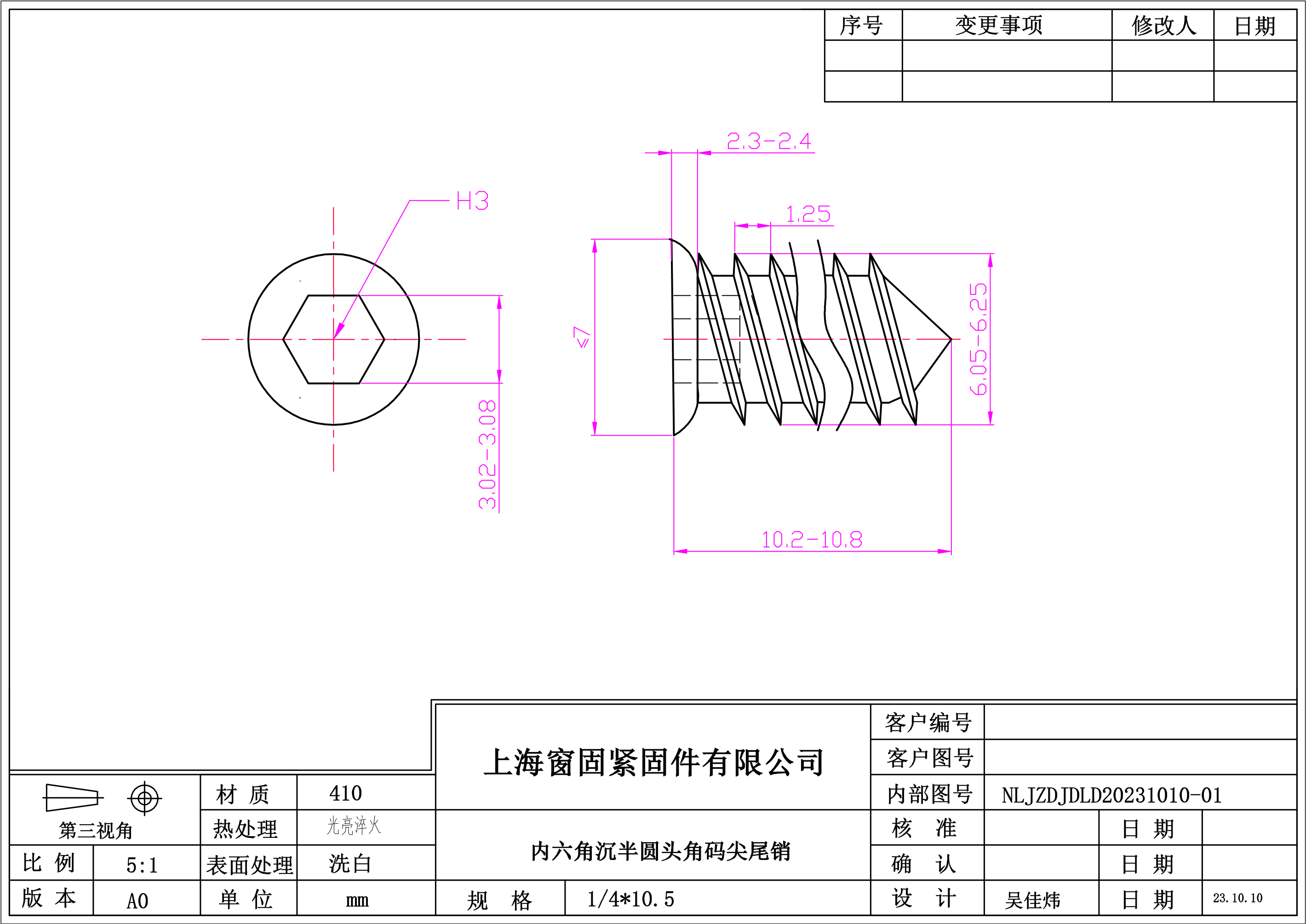 不锈钢410内六角沉半圆头角码尖尾销~1/4*10.5~洗白~(头径≤7)