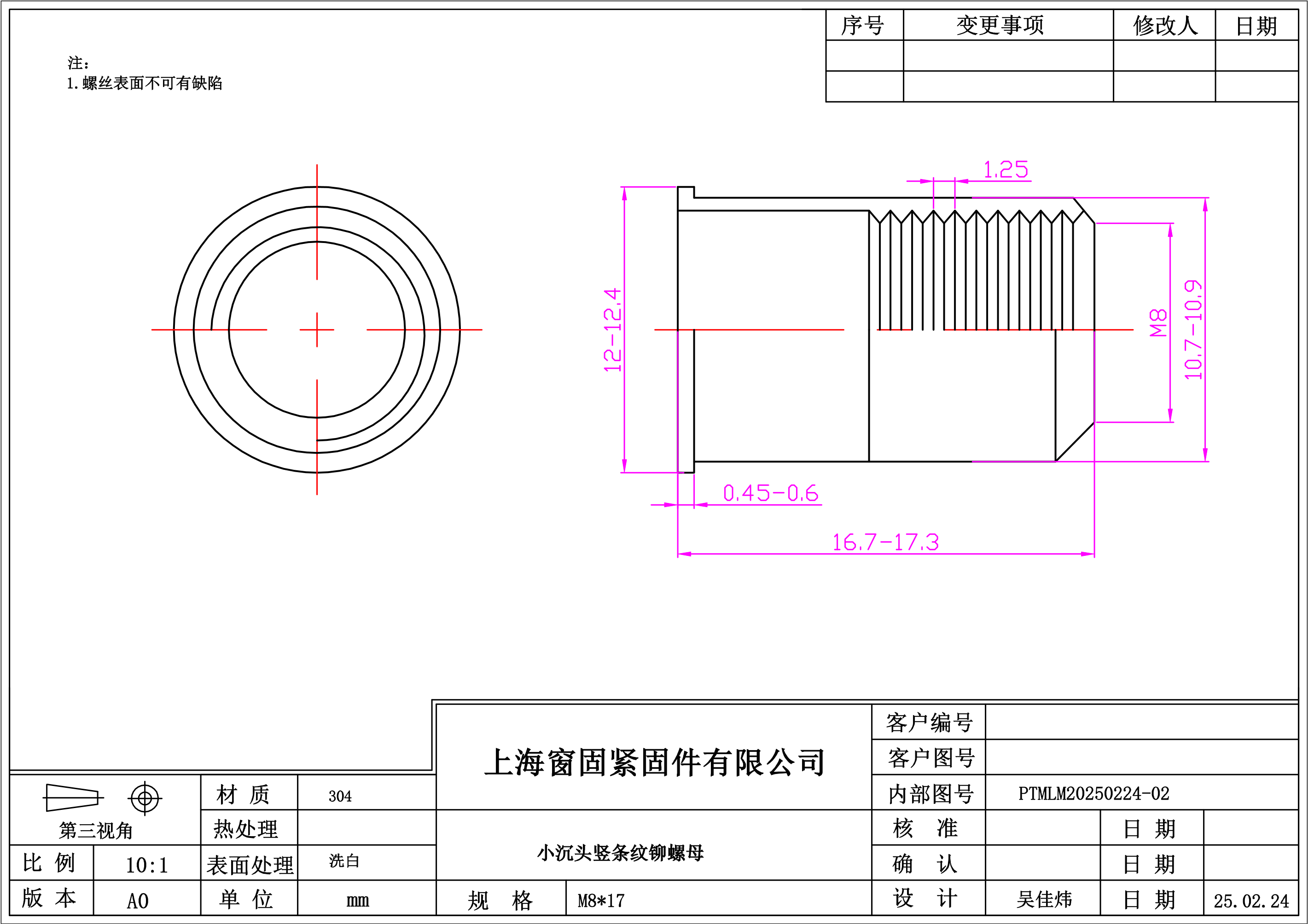 不锈钢304小沉头竖条纹铆螺母~8*17~洗白