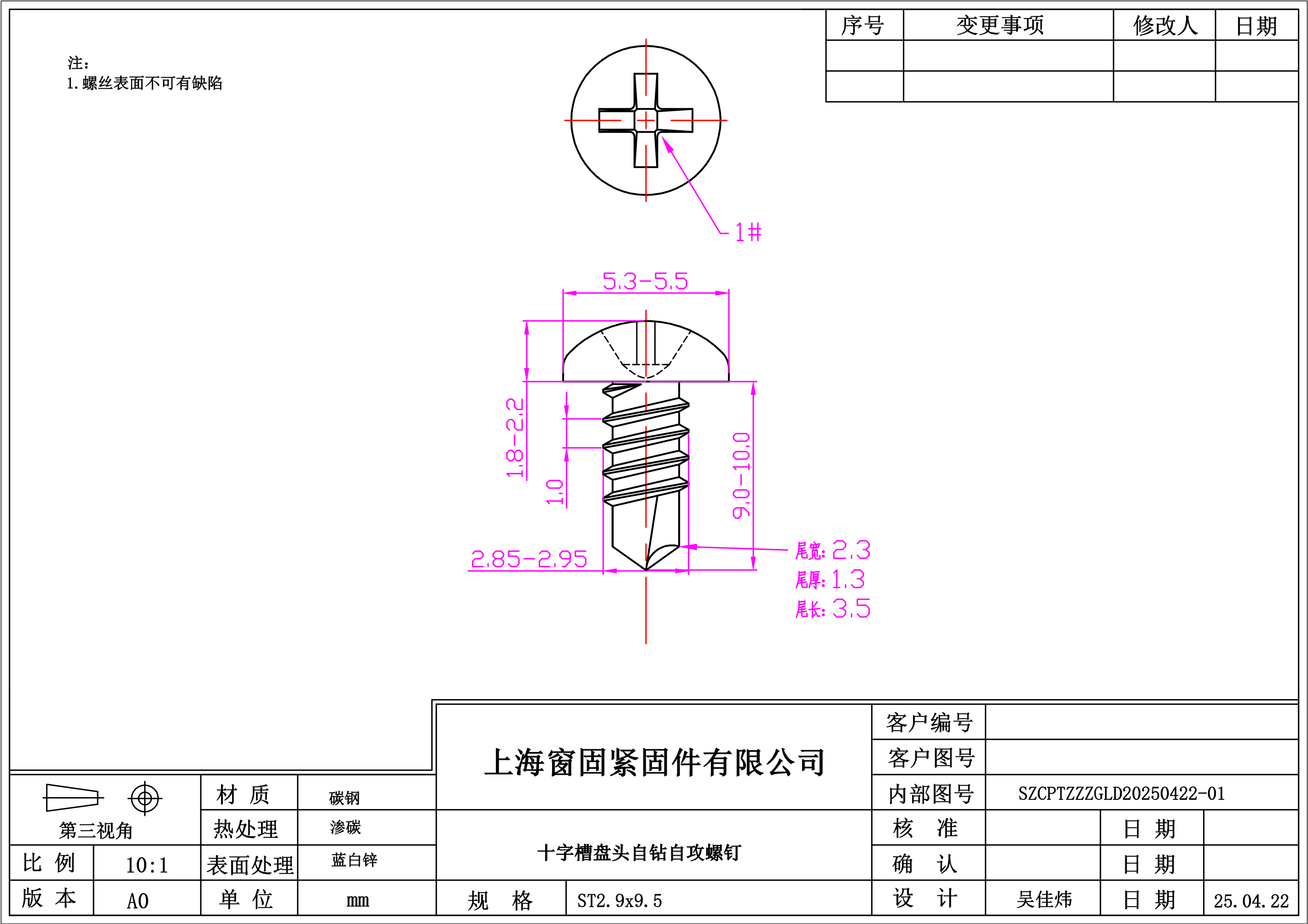 十字盘头自钻自攻螺钉~2.9*9.5~蓝白锌