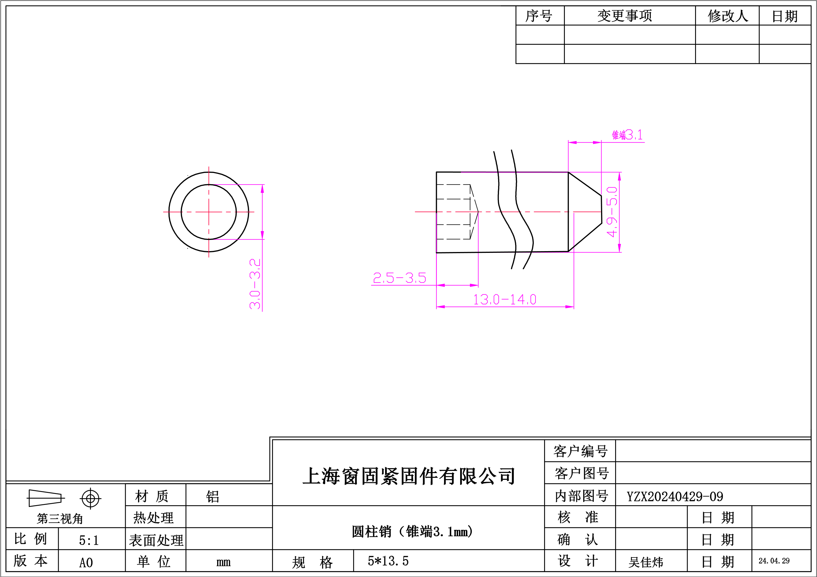 铝圆柱销~5*13.5~(锥端3.1mm)