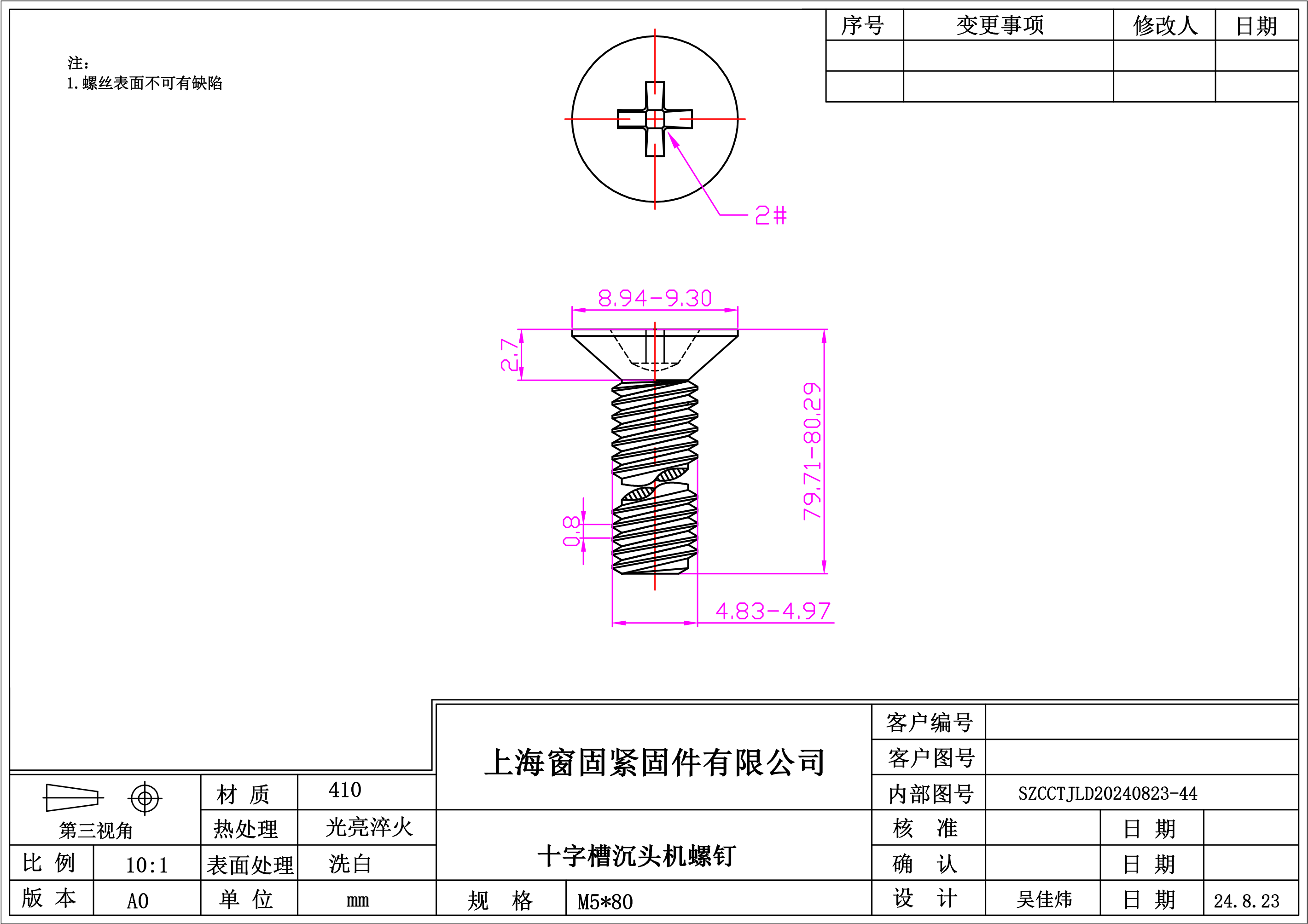不锈钢410十字沉头机螺钉~5*80~洗白