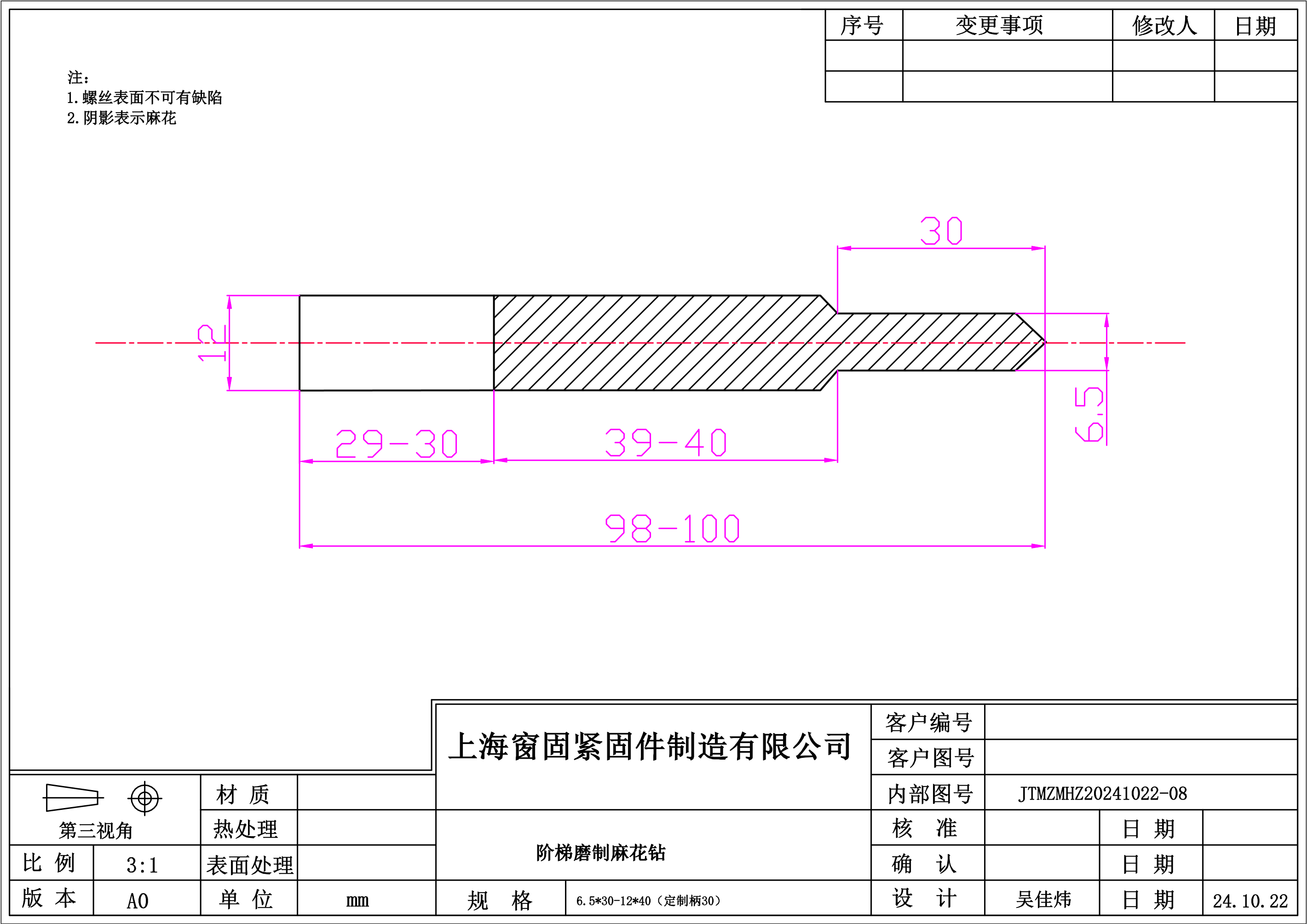 阶梯磨制麻花钻~6.5*30-12*40~镀钛~(定制,柄30)