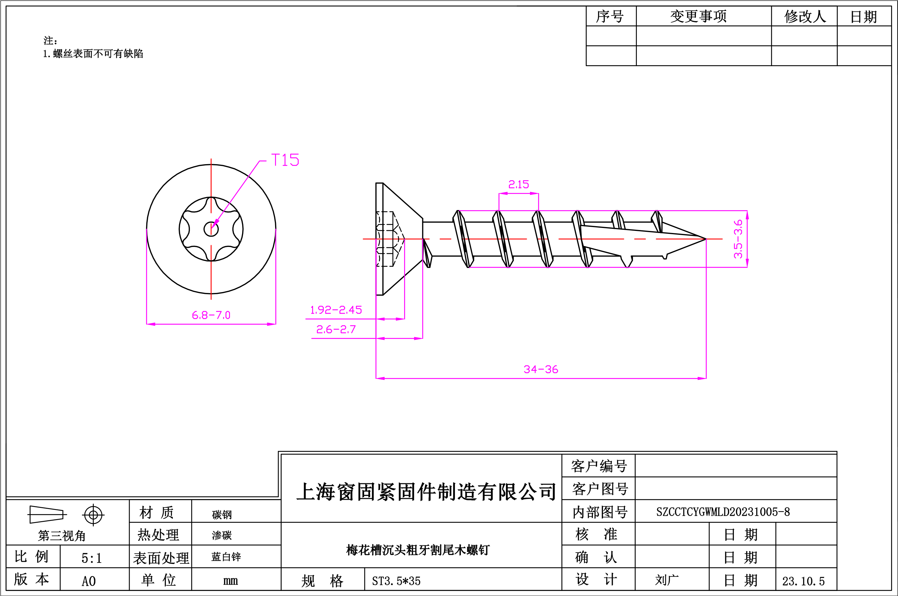 T15梅花沉头粗牙割尾木螺钉~3.5*35~蓝白锌