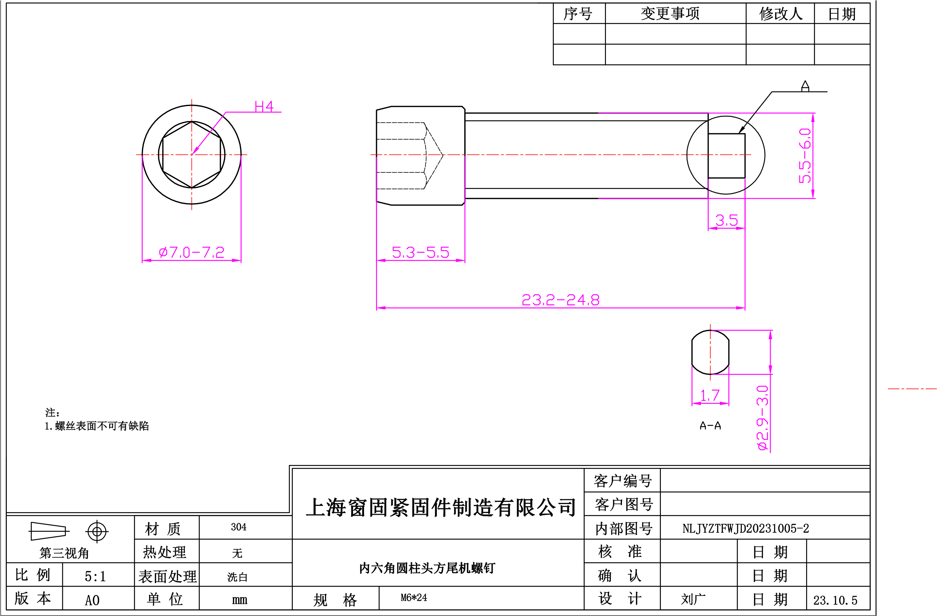 不锈钢304内六角圆柱头方尾机螺钉~6*24~洗白