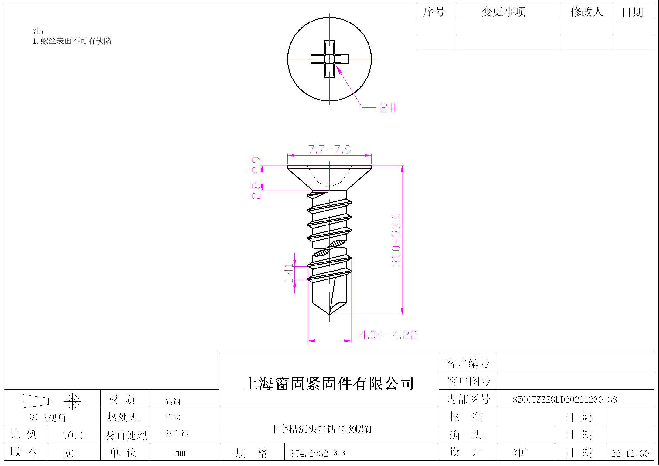 十字沉头自钻自攻螺钉~4.2*32~蓝白锌~(3.3)
