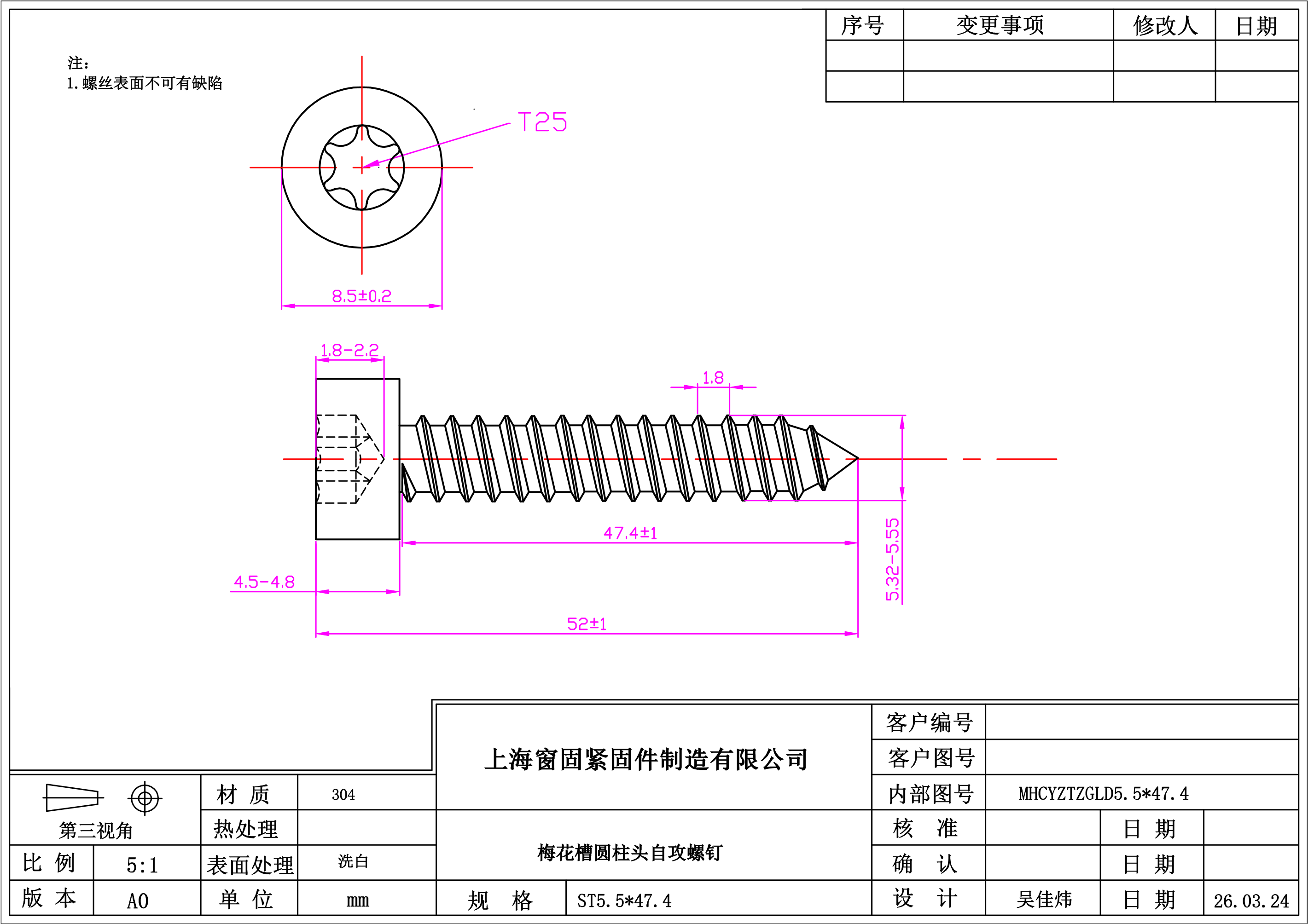 不锈钢304梅花圆柱头自攻螺钉~5.5*47.4~洗白