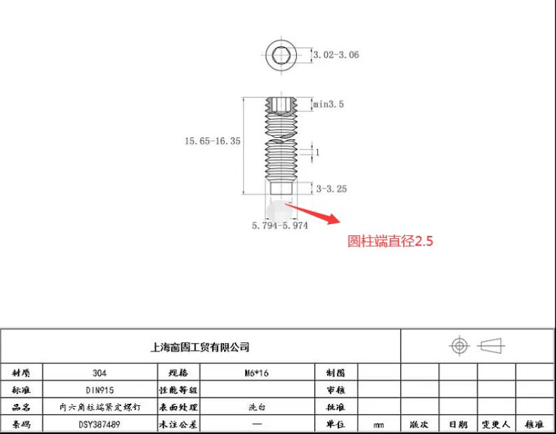 不锈钢304内六角柱端紧定螺钉~6*16~洗白~(柱端粗2.5,尾长3.0-3.5)