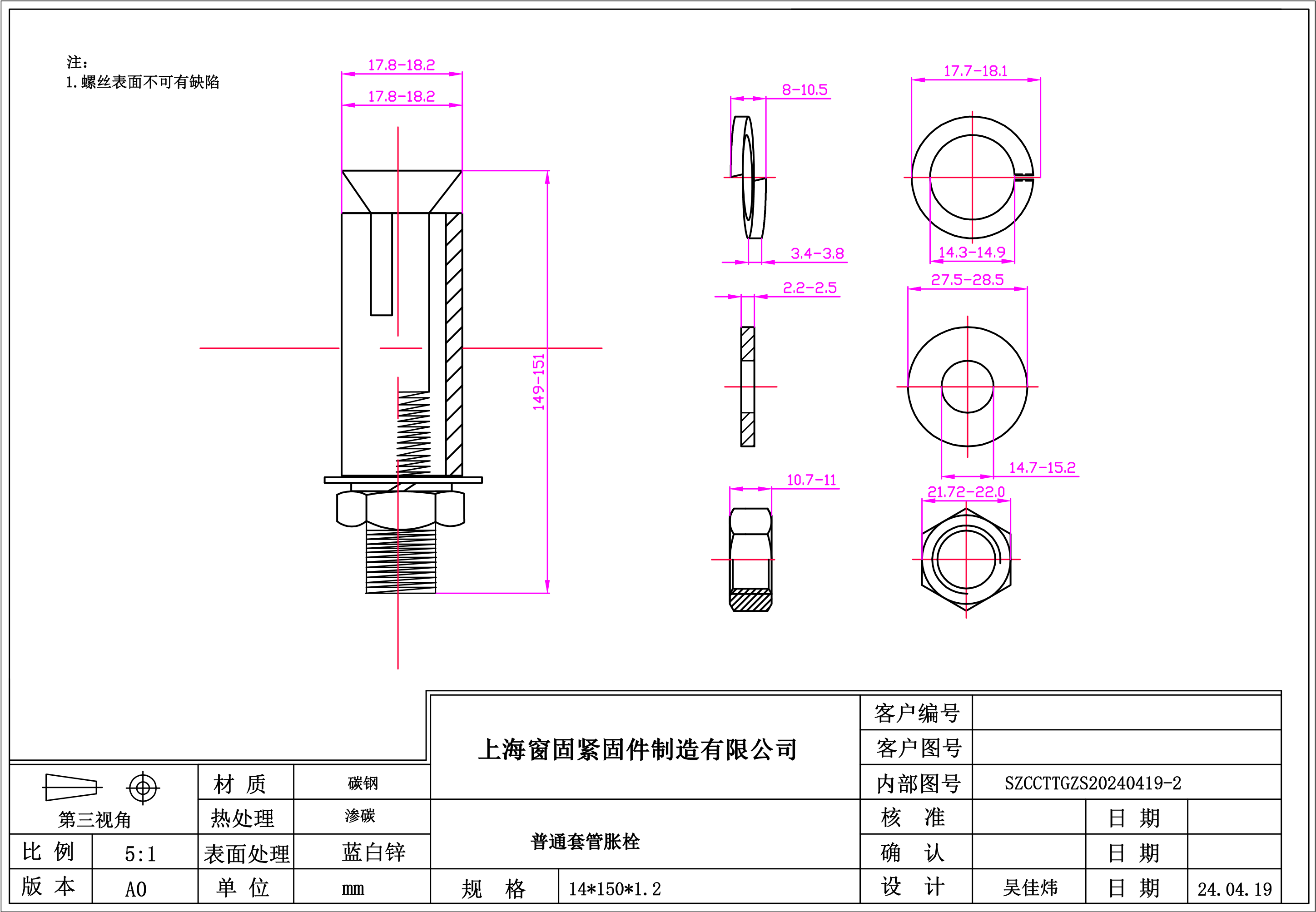 碳钢普通套管胀栓~14*150*1.2~蓝白锌