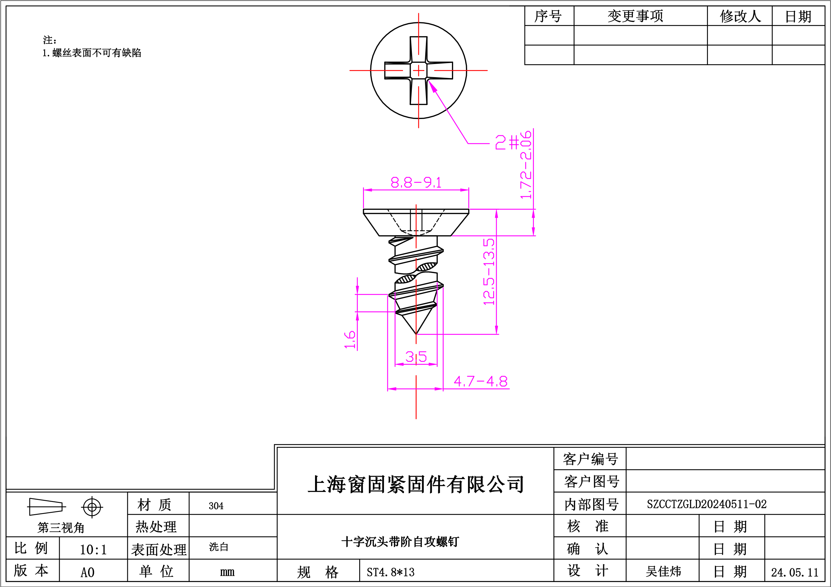 不锈钢304十字沉头带阶自攻螺钉~4.8*13~洗白~(头径9.0)