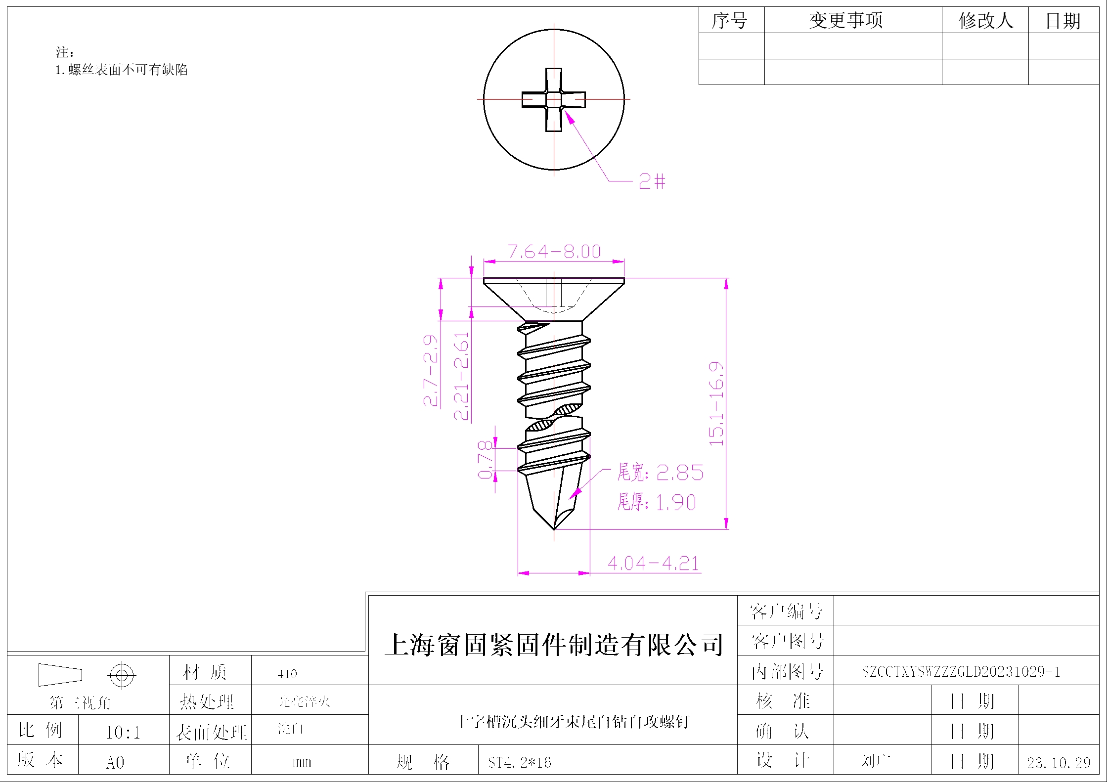 不锈钢410十字沉头细牙束尾自钻自攻螺钉~4.2*16~洗白