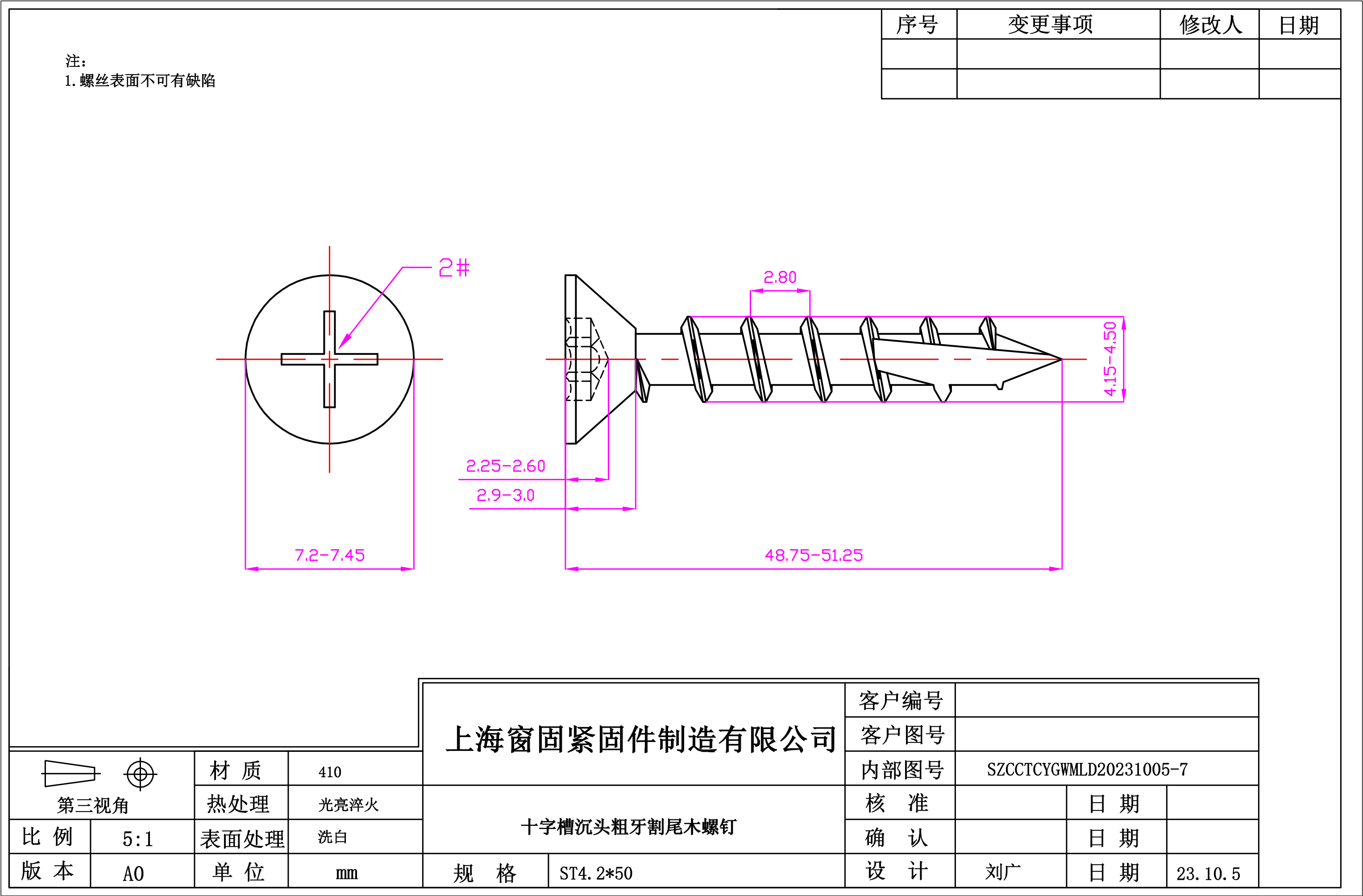 不锈钢410十字沉头粗牙割尾木螺钉~4.2*50~洗白~(头径7.2-7.45)