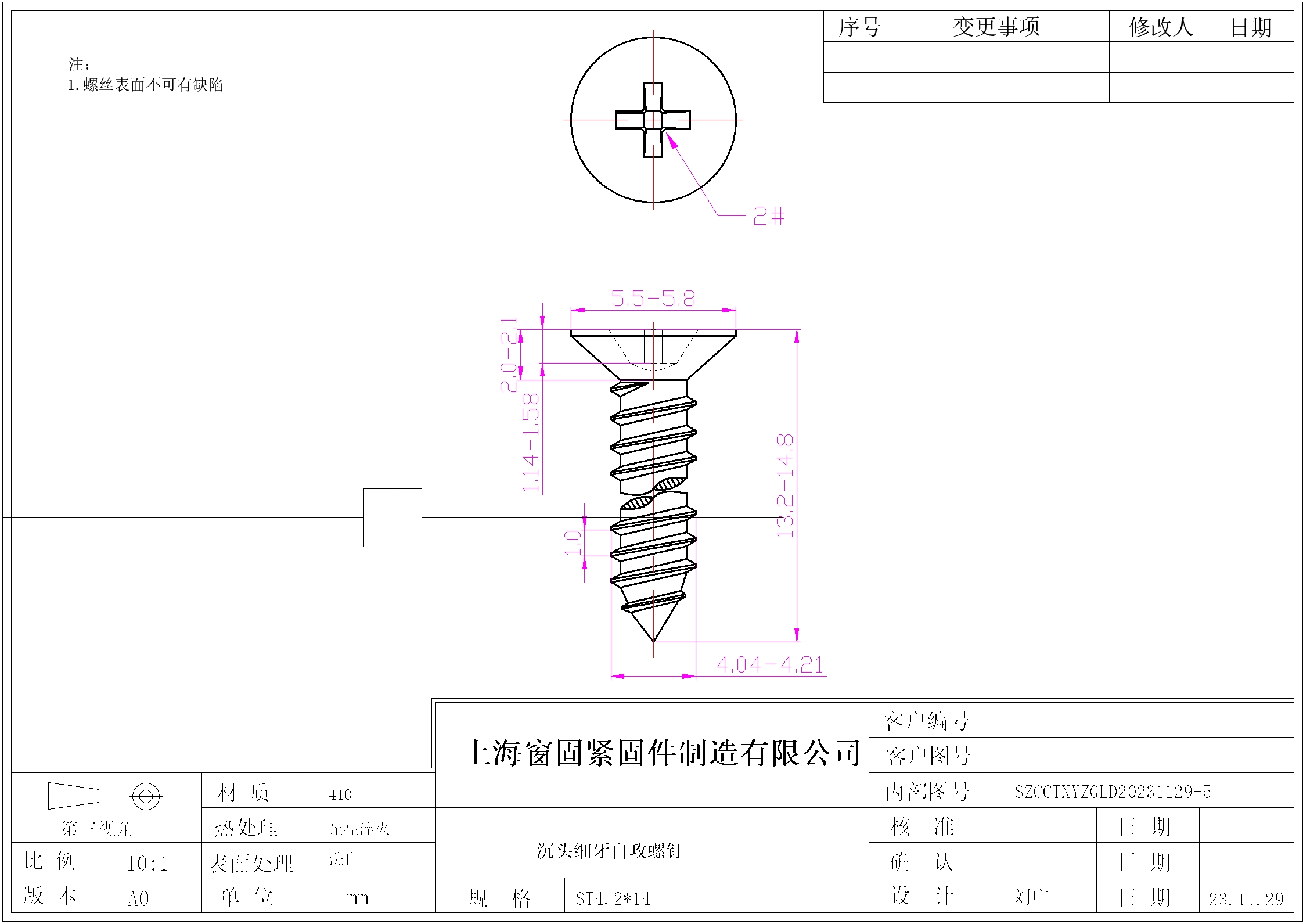 不锈钢410十字沉头细牙自攻螺钉~4.2*14~洗白~(头径5.5-5.8)