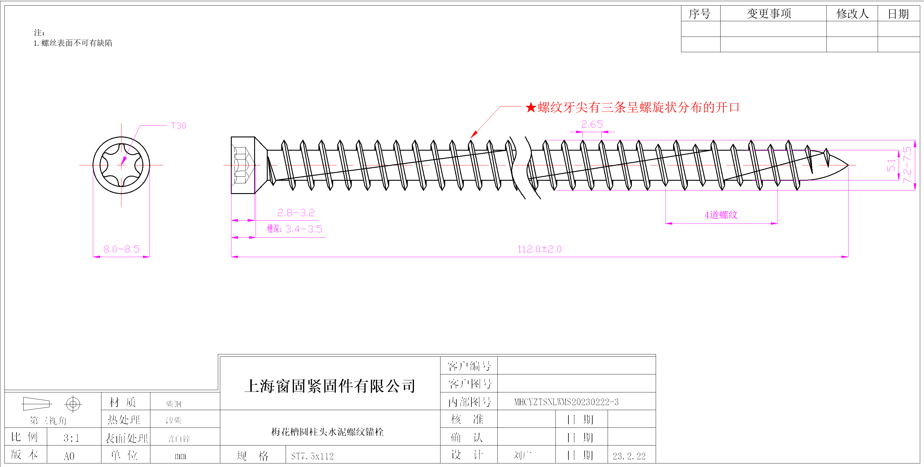 梅花圆柱头水泥螺纹锚栓~7.5*112~蓝白锌~(小头高低牙,线径5.6)