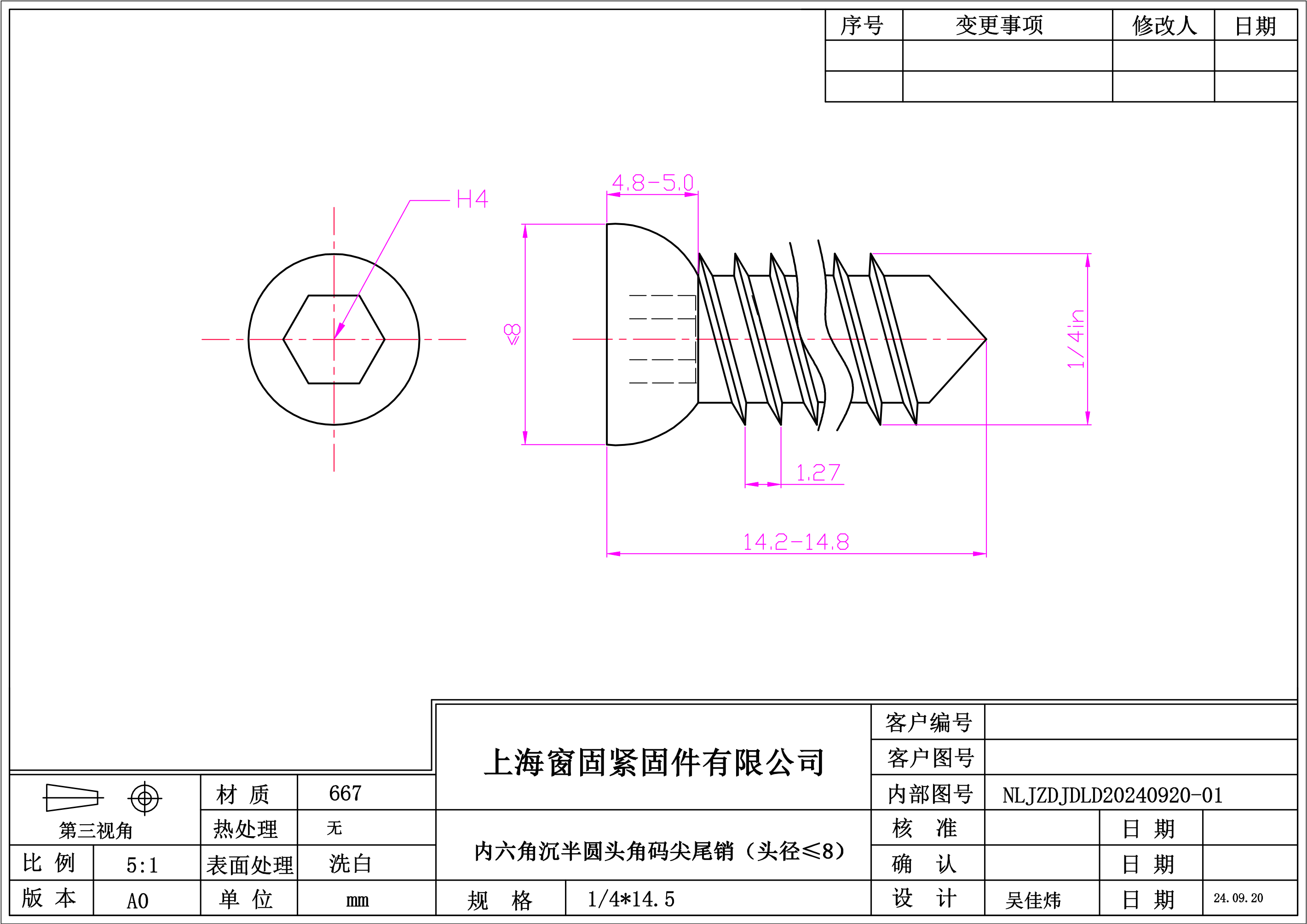 不锈钢667内六角沉半圆头角码尖尾销~1/4*14.5~洗白~(头径≤8)