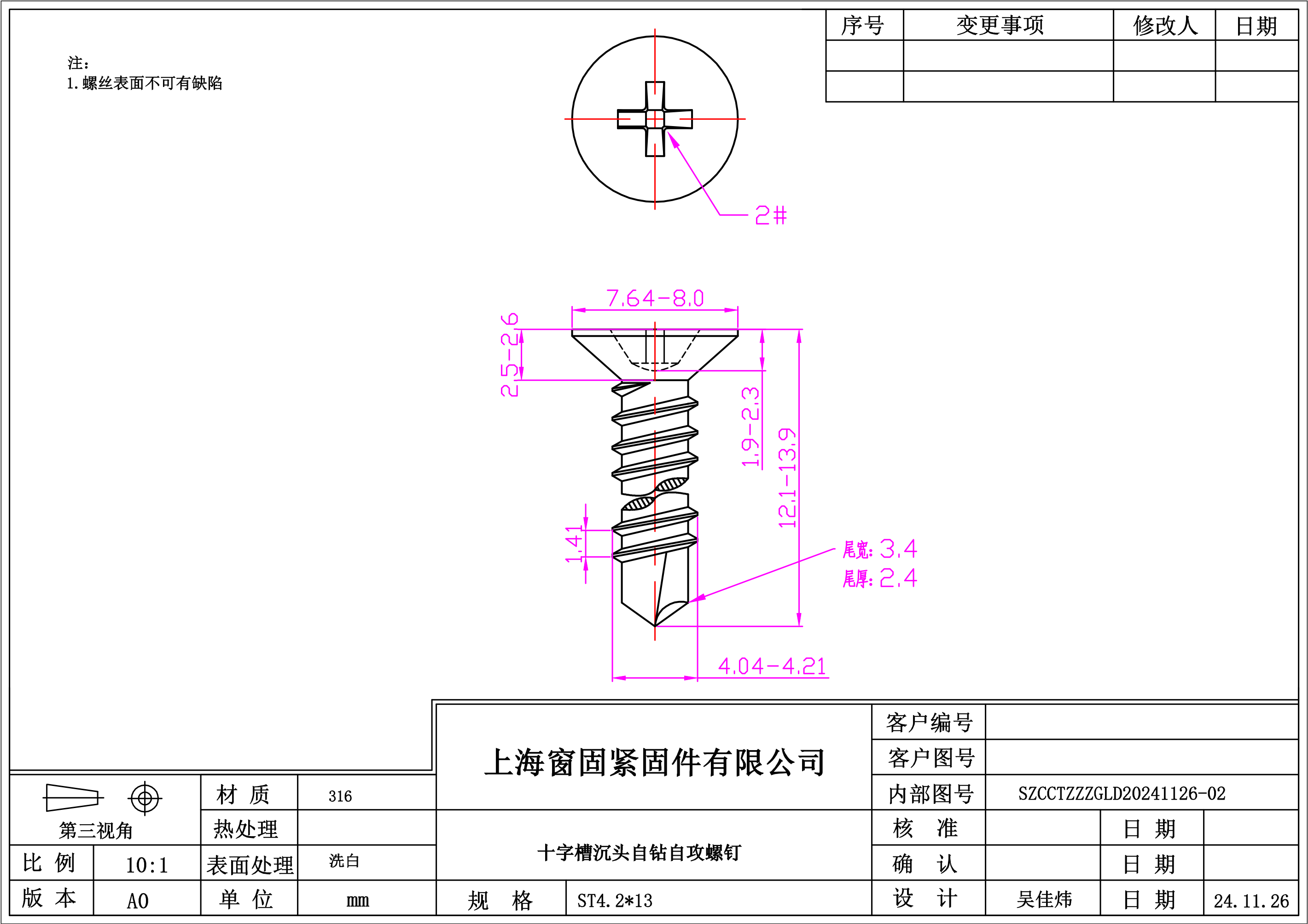 不锈钢316十字沉头自钻自攻螺钉~4.2*13~洗白