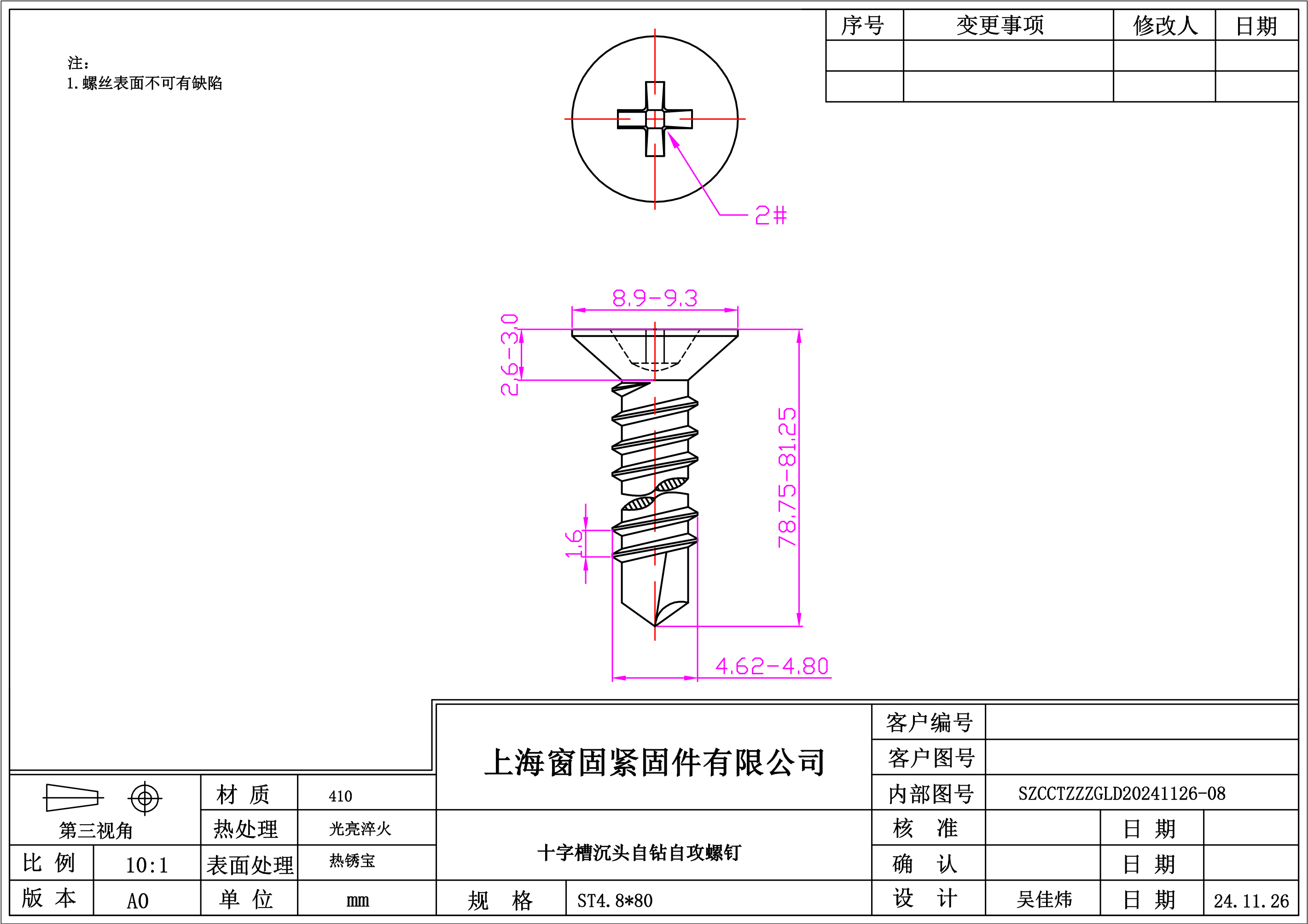 不锈钢410十字沉头自钻自攻螺钉~4.8*80~热锈宝