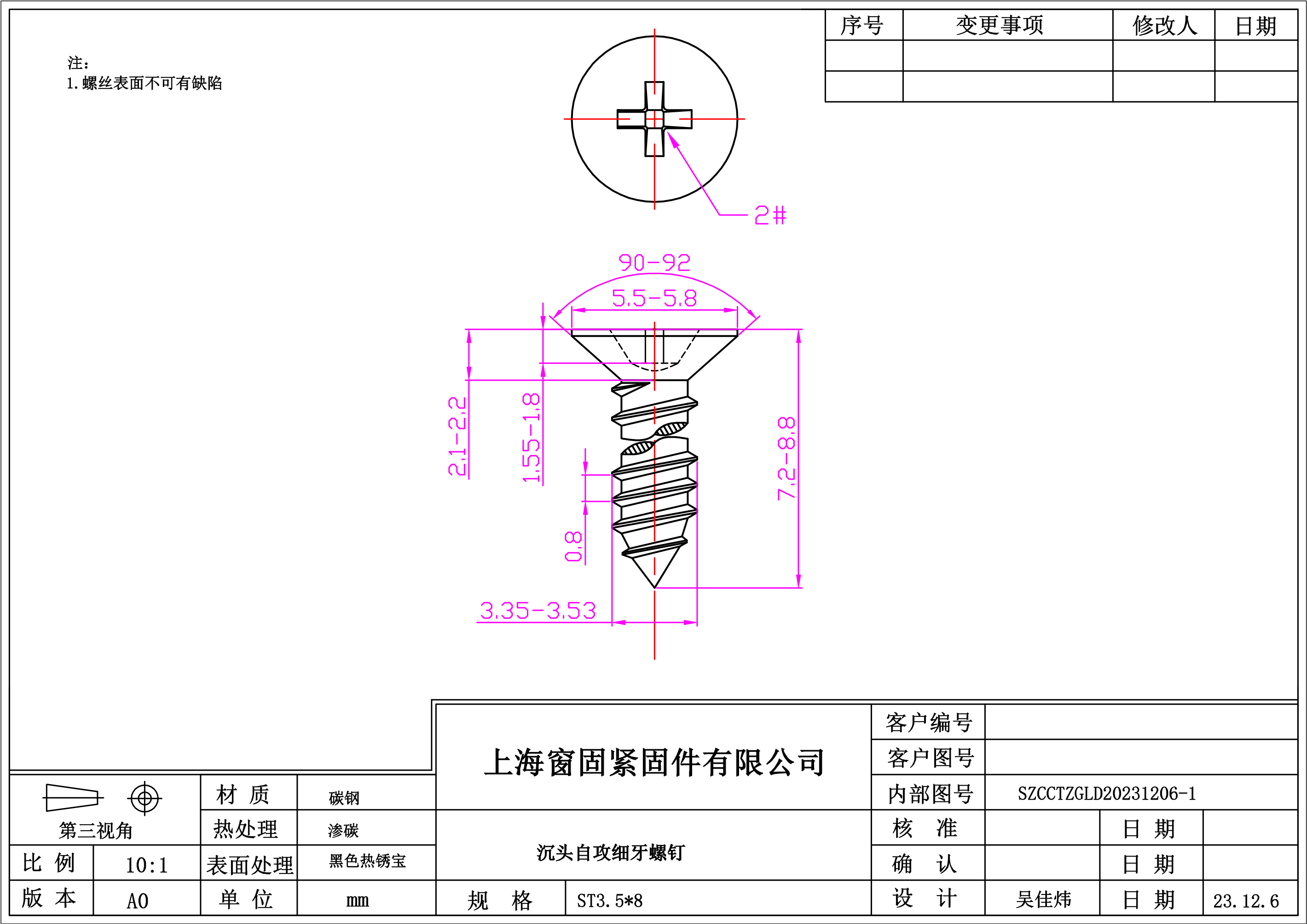 十字沉头细牙自攻螺钉~3.5*8~黑色热锈宝~(槽深1.55-1.8,头径5.5-5.8, 牙距0.8)