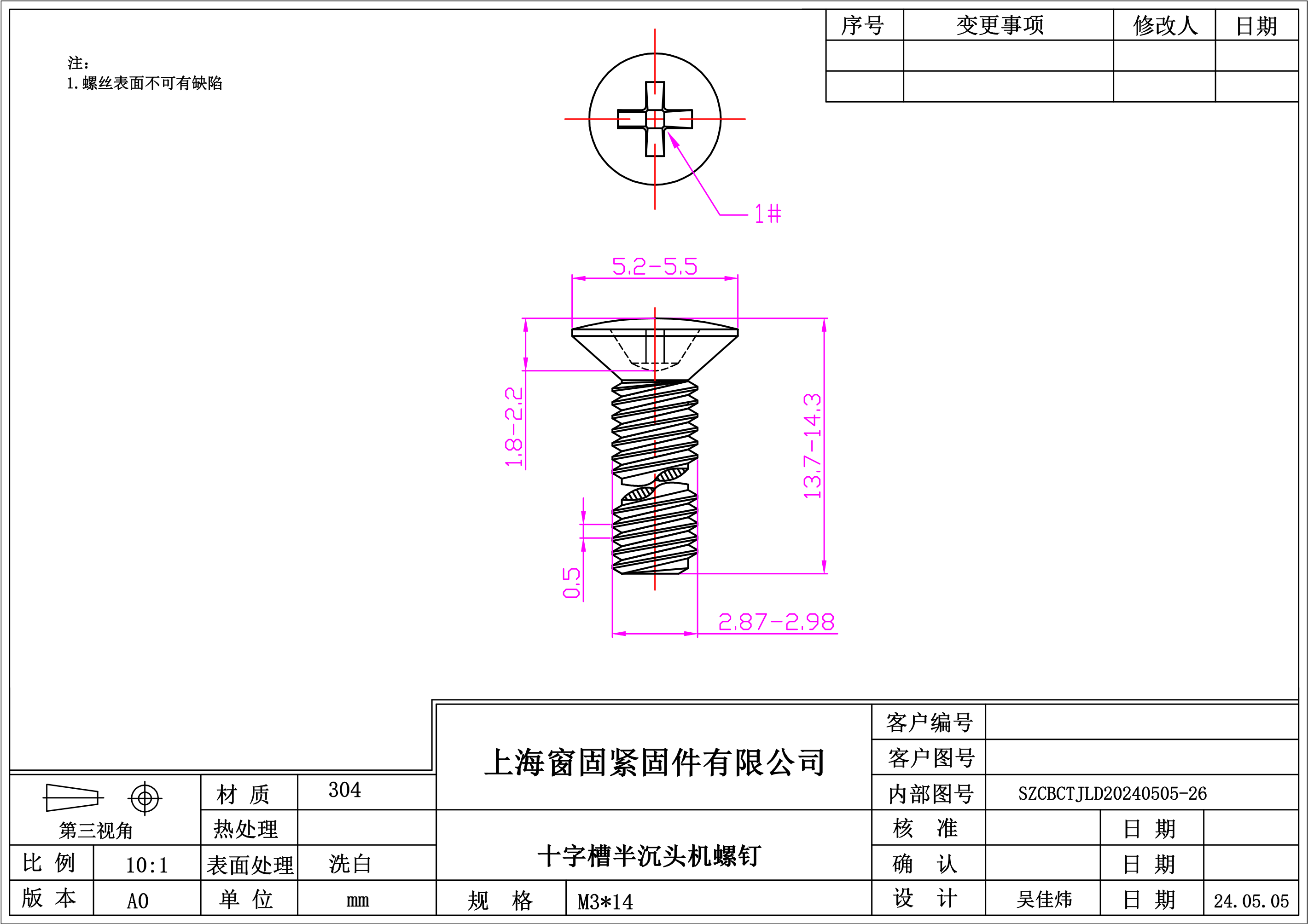 不锈钢304十字半沉头机螺钉~3*14~洗白
