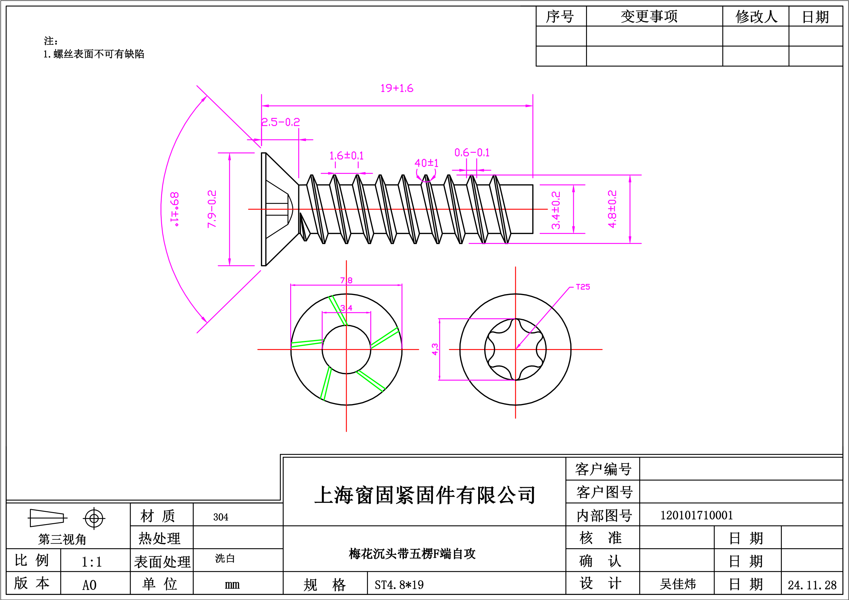 不锈钢304梅花沉头带五楞F端自攻螺钉~4.8*19~洗白