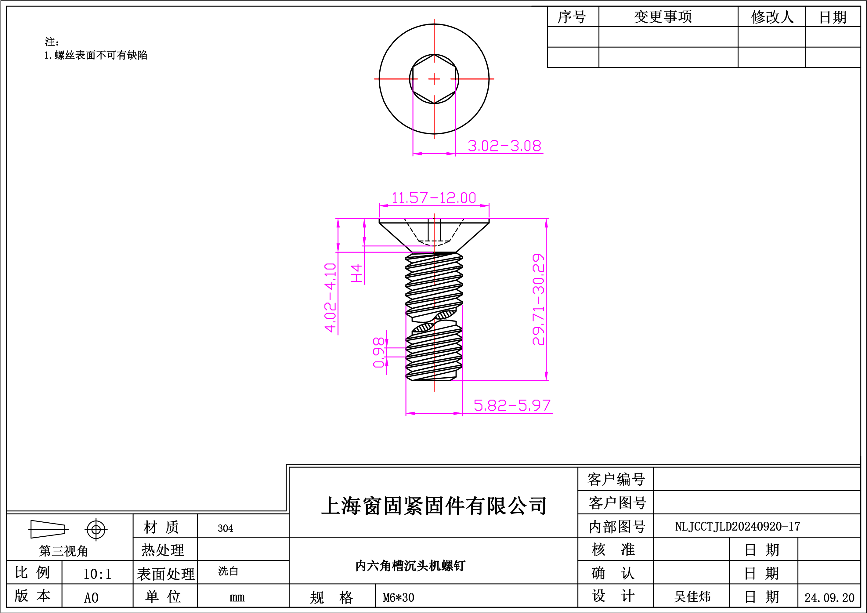 不锈钢304内六角沉头机螺钉~6*30~洗白