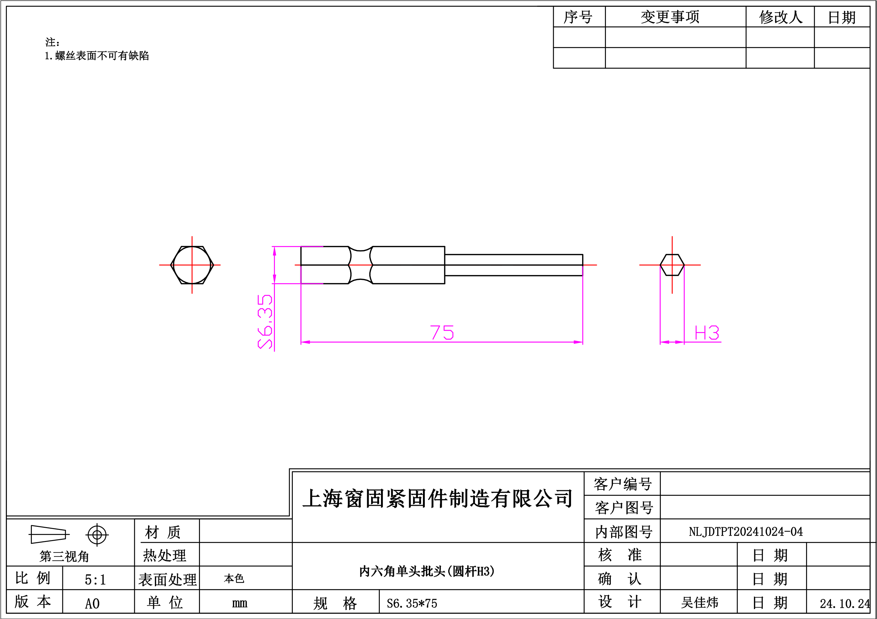 内六角单头批头~S6.35*75~(圆杆H3)