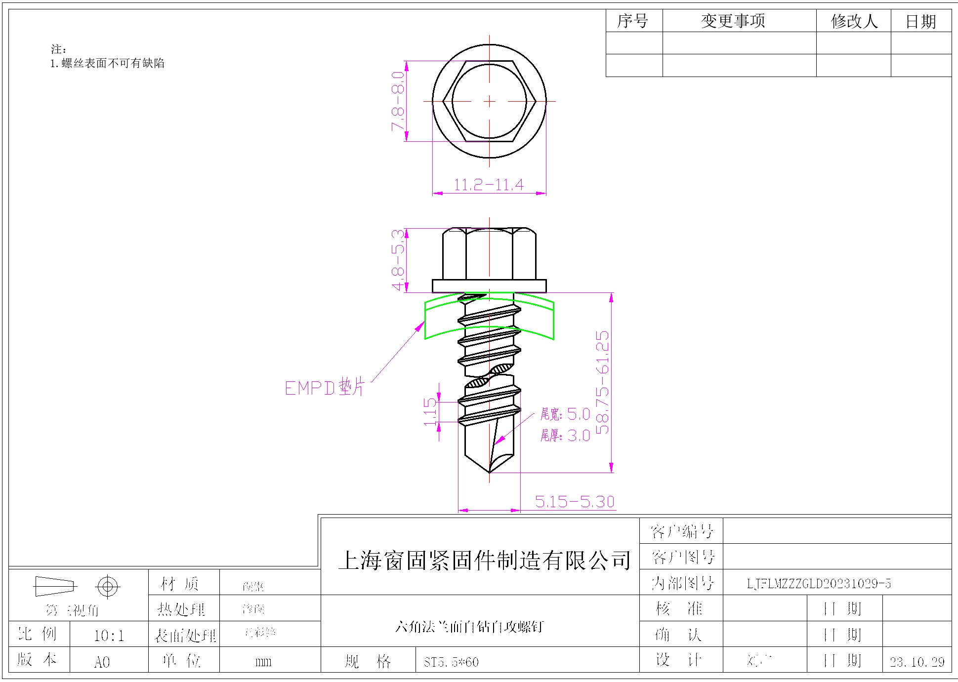 六角法兰面自钻自攻螺钉~5.5*60~五彩锌~(EPDM垫片)