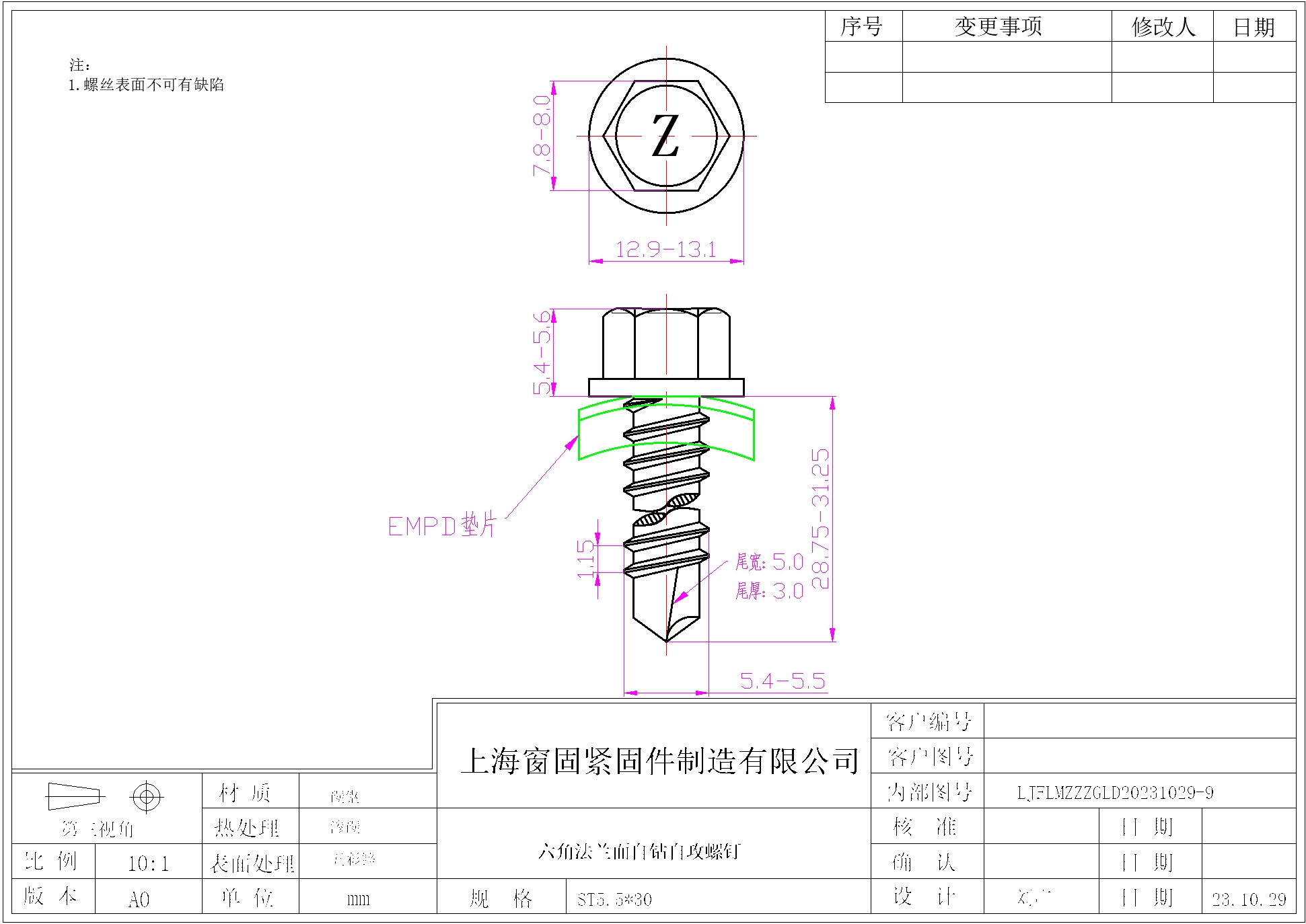 六角法兰面自钻自攻螺钉~5.5*30~五彩锌~(Z标,EPDM垫片)