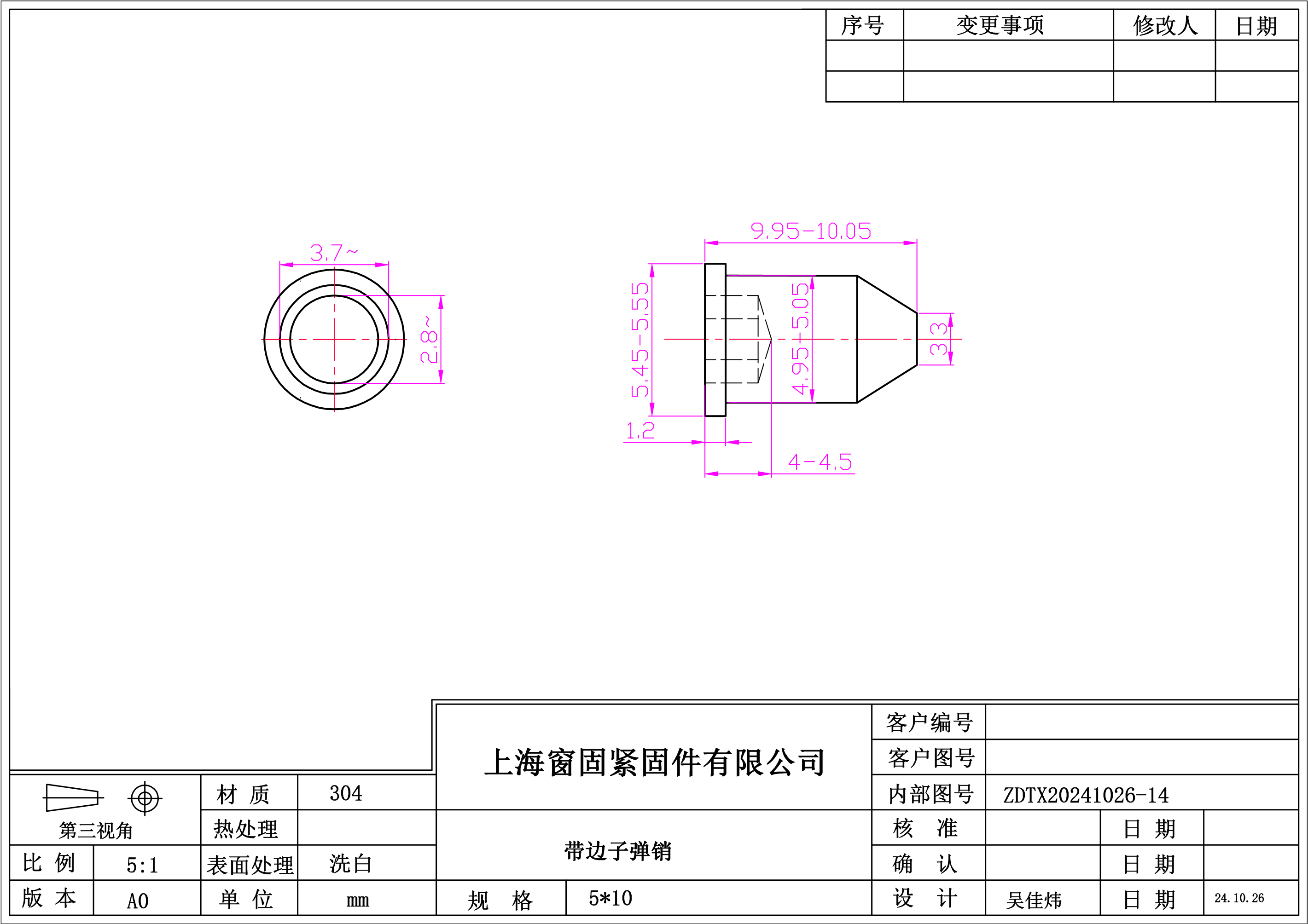 不锈钢304带边子弹销~5*10~洗白