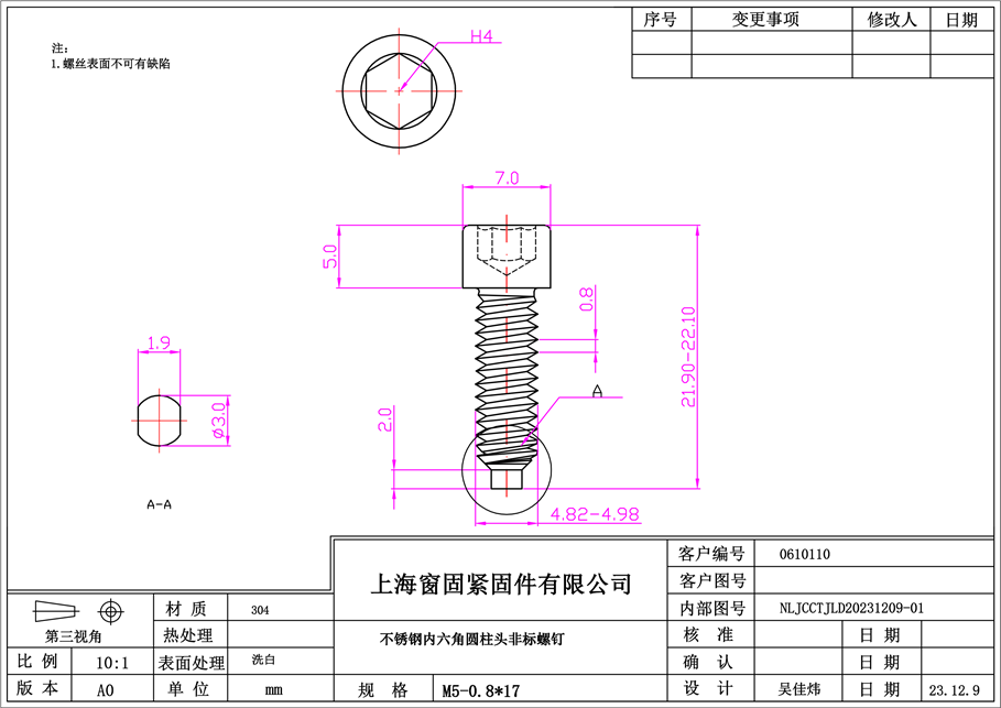不锈钢304内六角圆柱头方尾机螺钉~5*17~洗白
