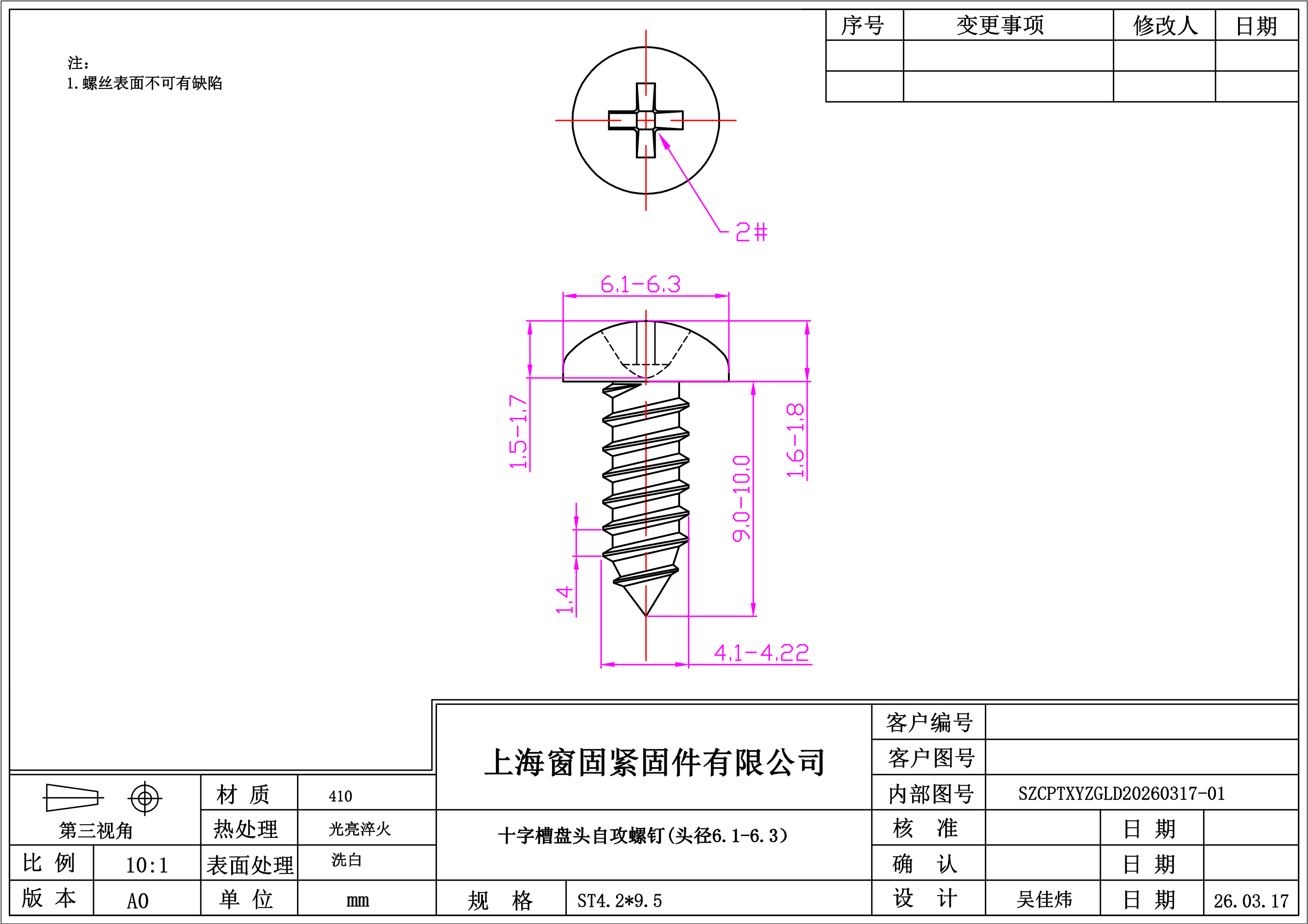 不锈钢410十字盘头自攻螺钉~4.2*9.5~洗白~(头径6.1-6.3)
