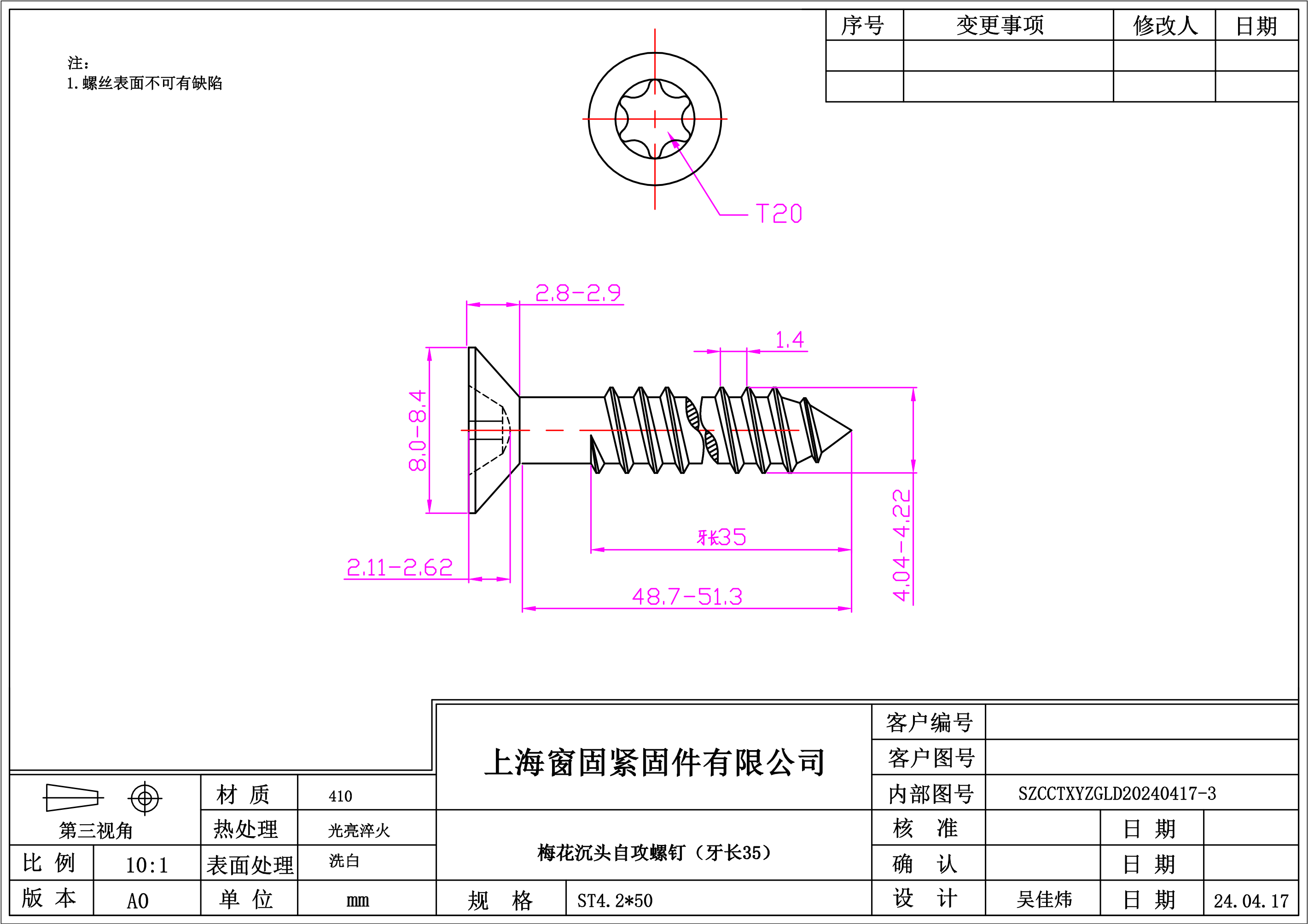 不锈钢410梅花沉头自攻螺钉~4.2*50~洗白~(牙长35)