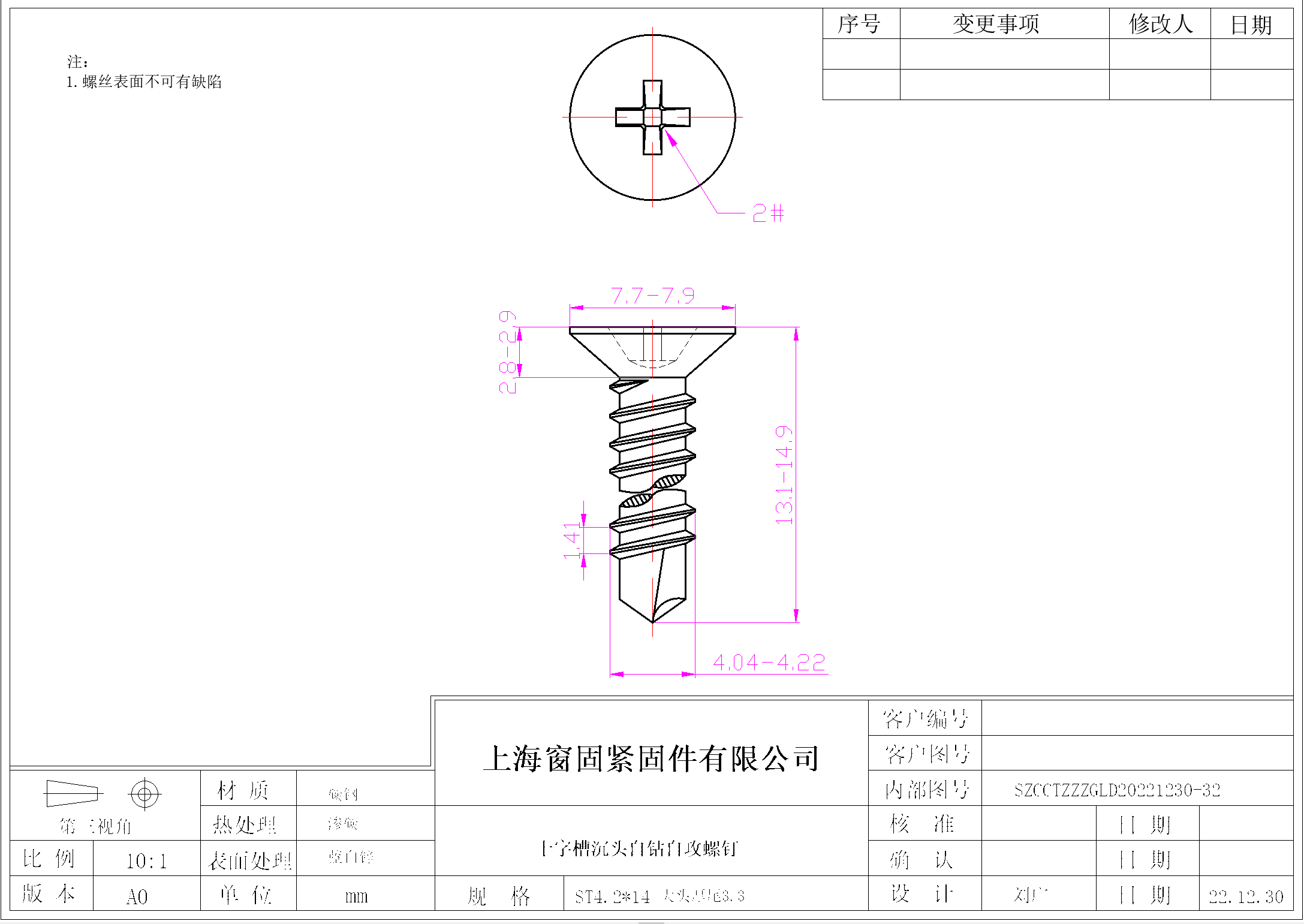 十字沉头自钻自攻螺钉~4.2*14~蓝白锌~(大头厚尾3.3)