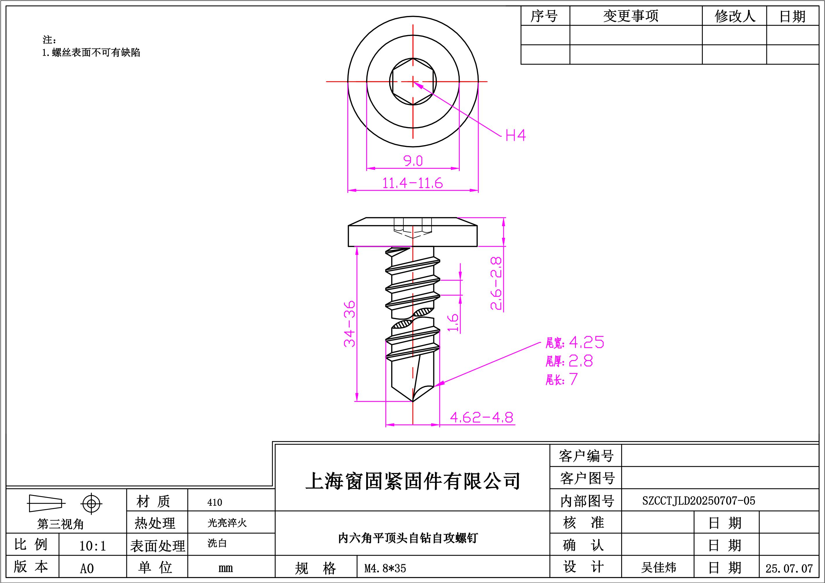 不锈钢410内六角平顶头自钻自攻螺钉~4.8*35~洗白